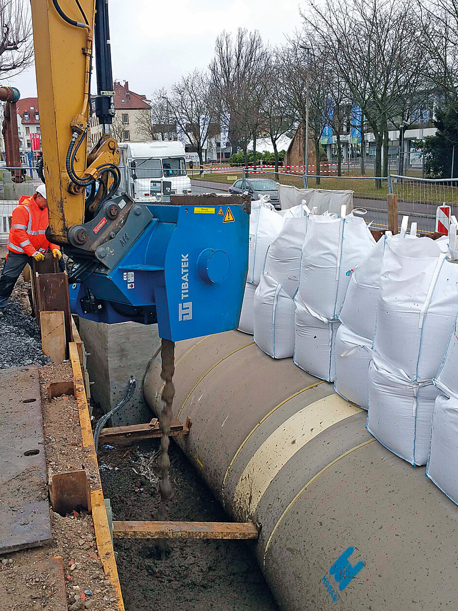 Die Bauunternehmung Michel Bau wurde vom Abwasserbetrieb der Stadt Bruchsal (Baden-Württemberg) beauftragt mit der Erneuerung eines Straßenmischwasserkanals inklusive des Abbruchs des Altkanals, der Herstellung einer Vorflut bis 600 l/sek und der Verlegung neuer GFK-Sonderprofile in den Abmessungen 3 200 mm/2 000 mm. Ausgeschrieben war auch der Einsatz von Flüssigboden zur optimalen Bettung der Rohre bis zum Kempfer, danach erfolgte die Verfüllung mit ausgehobenen Boden und Verdichtung.