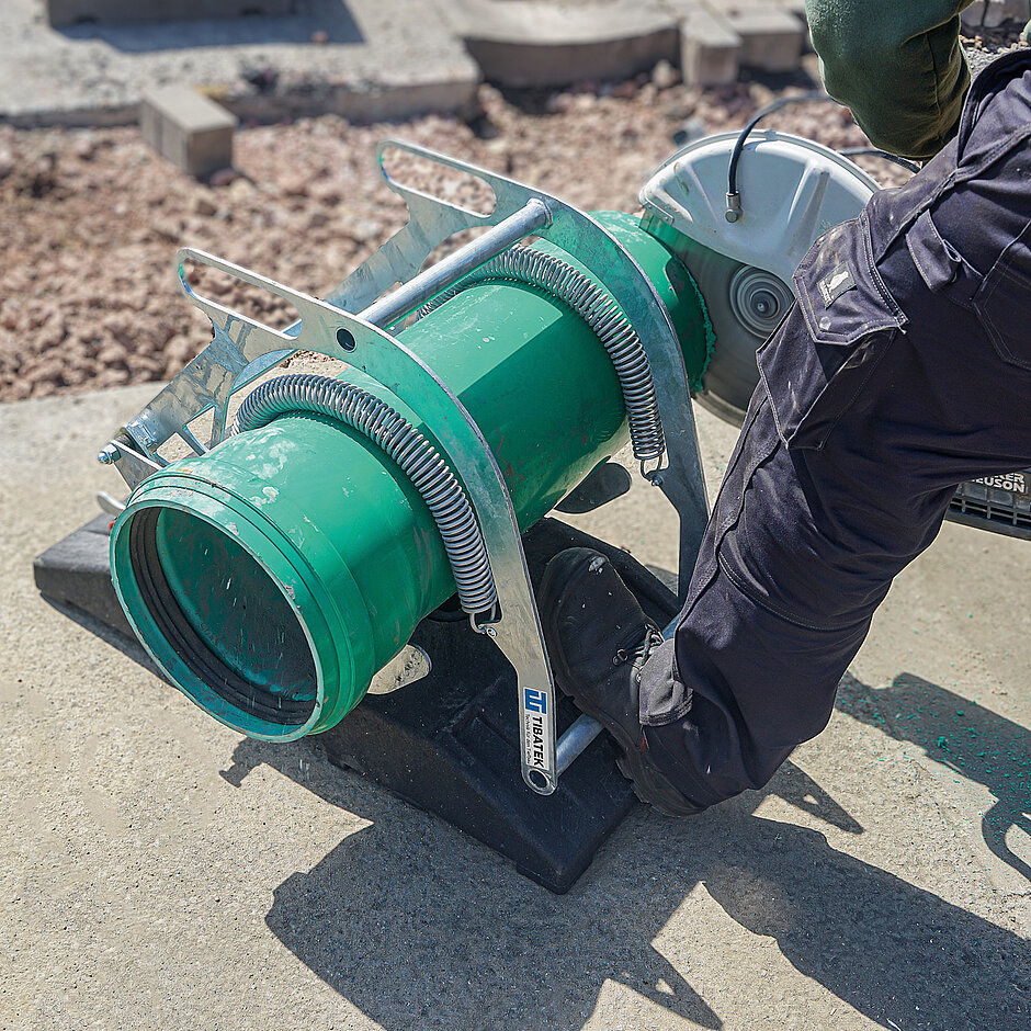 Im Detail ist die KV-250 geeignet für Rohrleitungen aus Kunststoff und Ton im Bereich von DN 110 bis DN 250 und wird für den Einsatz in einen vorhandenen Bakenfuß K1 über ein Vierkantrohr 60 x 60 gesteckt. Der Anwender kann dann das Rohr in das Rollenprisma der KV-250 einlegen, mit zwei Zugfedern in der Lage sichern und mit dem gefahrlosen Schneiden der Rohrleitungen auf der Baustelle beginnen. Weder befindet sich ein Fuß des Arbeiters dabei unmittelbar in der Nähe des Trennschneiders, noch muss er in unsicherem Stand arbeiten. Die flexible Ausgestaltung der Rollenwanne erlaubt es dann anschließend, die Rohre einfach mit dem Fuß weiterzudrehen. t