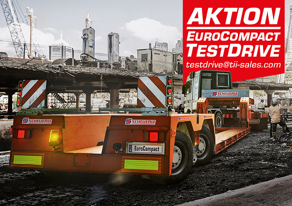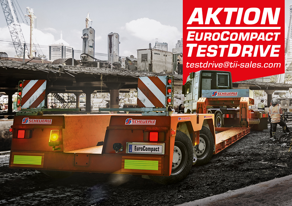 Ab November haben Transportunternehmer die Gelegenheit, sich von den Qualitäten der neuen EuroCompact Modelle FL02 und FL03 im Praxiseinsatz zu überzeugen. Dann ruft SCHEUERLE, ein Unternehmen der Transporter Industry International Group (TII Group) von Unternehmerfamilie Rettenmaier aus Heilbronn, zum großen EuroCompact Testdrive auf. SCHEUERLE stellt die beiden neuen Modelle FL02 und FL03 mit zwei- beziehungsweise dreiachsigem Pendelachsen-Heckfahrwerk in Verbindung mit einer geeigneten 6x4-Sattelzugmaschine zur Verfügung. Beide EuroCompact Modelle verfügen über eine Vollausstattung und eigenen sich damit für unterschiedlichste Ladungen wie Bau-, Agrar- sowie Forstmaschinen und ähnliches Gerät.