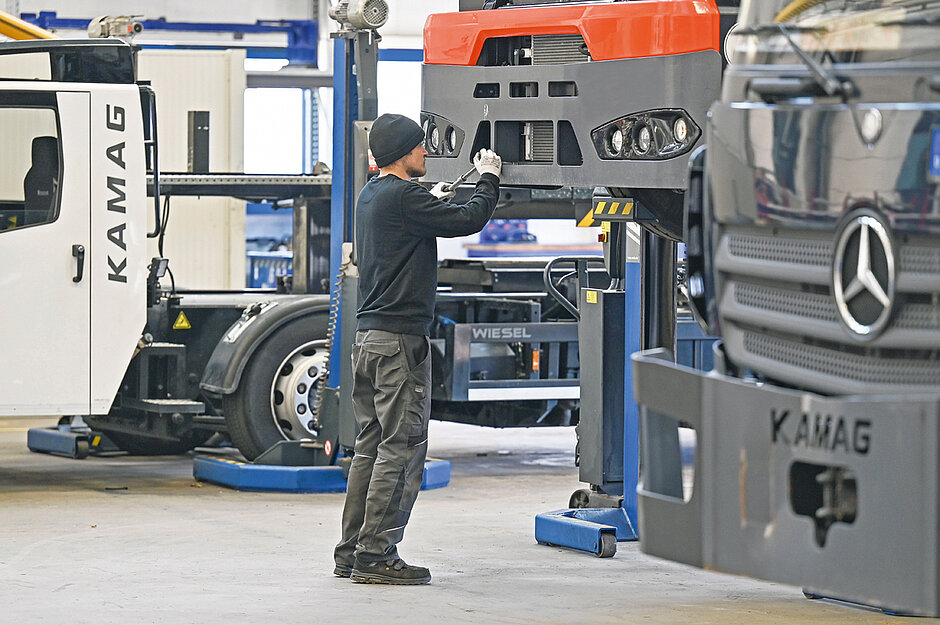 Die Kamag-Transporttechnik hat ihre Servicekapazitäten im Industriegebiet Ulm-Donautal ausgebaut. Ein größerer Werkstattbetrieb mit moderner Ausstattung und optimierten Prozessen bietet ein umfassendes Serviceangebot für alle Hoflogistik-Fahrzeuge von Kamag. »Der Betrieb verfügt über sechs Servicebahnen, die über sechs Tore direkt zugänglich sind. Damit vermeiden wir zeitaufwendige Rangiermanöver«, erklärt Werkstattmeister Patrick Scheck. »Zudem haben wir Wegstrecken für die Fahrzeuge zwischen einzelnen Arbeitsschritten minimiert und die Servicebahnen so angeordnet, dass alle notwendigen Tätigkeiten in einer logischen Folge hintereinander erledigt werden können. Die Werkstatt verfügt zudem über einen Bremsenprüfstand in der Dialogannahme. Diese Servicebahn erfüllt auch alle Ansprüche einer Prüflinie.« Neu ist ein abgeschirmter Bereich für Stahlbauarbeiten. Ein Service der Werkstatt ist der »Eingangs-Check«, dabei wird das Fahrzeug einer 100 %-Kontrolle auf Verschleiß und Funktion unterzogen. »Diese Leistung ist für die Kunden kostenlos. Sie entscheiden anschließend selbst, welche Arbeiten sie aufgrund unserer Diagnose durchführen lassen«, so Scheck. Hinzu kommt ein Teilelager, das schnell zugänglich ist, auch Ersatzfahrzeuge stehen bereit. Zehn Fachkräfte kümmern sich um die Bedürfnisse der Hoflogistik-Fahrzeuge, darunter auch speziell ausgebildetes Personal für Arbeiten an Hochvolt-Systemen. So sollen im Servicebetrieb auch elektrisch angetriebene Modelle in den besten Händen sein. t