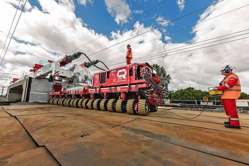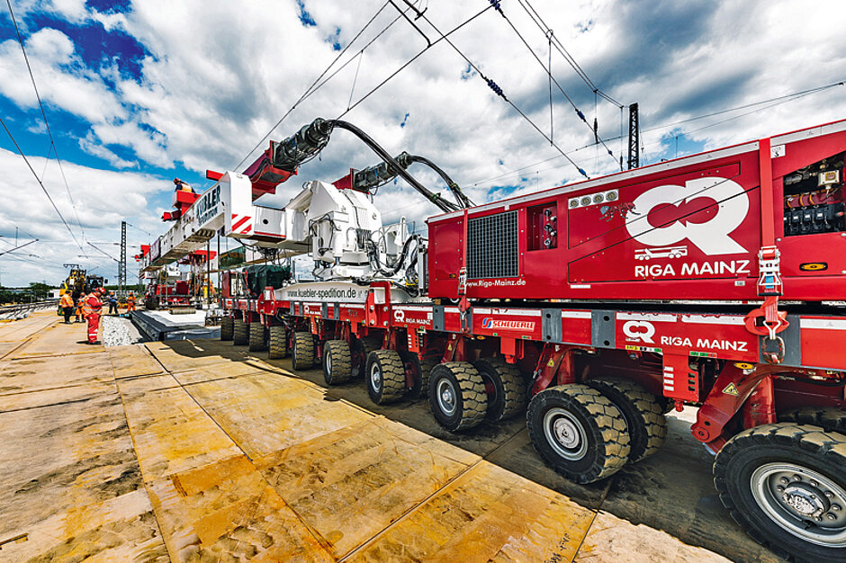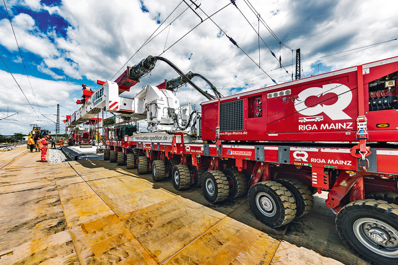 Ein Jahr hatte das Mainzer Unternehmen Zeit, eine ökonomische Lösung für diese komplexe Kombination aus Transport, Abriss und Montage zu entwickeln. Bestandteil dieses Einsatzes sind SPMT (Self Propelled Modular Transporter) von Scheuerle. Als Aufnahme für die neue Betonbrücke dient eine Seitenträgerbrücke zwischen den beiden elektronisch miteinander verbundenen Transportplattformen. Insgesamt 20 SPMT-Achslinien sind nötig, um die Gesamtlast von 570 t aufzunehmen. Auf die Seitenträgerbrücke installiert Riga Mainz eine selbstentwickelte und nach eigenen Aussagen in Deutschland bislang einmalige Verfahrenstechnik mit einer Hubkraft von 500 t. Ein weiterer Vorteil der Hubanlage ist die verhältnismäßig geringe Bauhöhe. Der Transport inklusive Ladegut kann somit unter den Oberleitungen hindurch fahren. Das erspart dem Bauherren eine Menge Zeit und erhebliche Kosten.