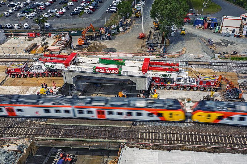 Durchdacht wie Transportmodule und Hebetechnik ist das Vorgehen von Riga Mainz. »Wir fahren mit den beiden SPMT-Plattformen auf der Straße unter die alte Brücke, trennen sie aus den Verankerungen und drücken sie anschließend mithilfe der Hebeanlage heraus. Dann können wir das alte Bauwerk auf den SPMT aus dem Gleisbett fahren. Anschließend hängen wir die neue Brücke in die Seitenträgerbrücke ein und bringen sie über eine der übrigen Brücken ins Gleisbett ein. Sobald sie auf der richtigen Höhe angekommen ist, manövrieren wir sie mithilfe der elektronischen Vielwegelenkung seitwärts unter den Oberleitungen hindurch in die entstandene Lücke und setzen sie dort ein«, erklärt Langer. Dieses Prozedere wiederholt Riga Mainz, bis alle der acht Brücken ausgetauscht sind.