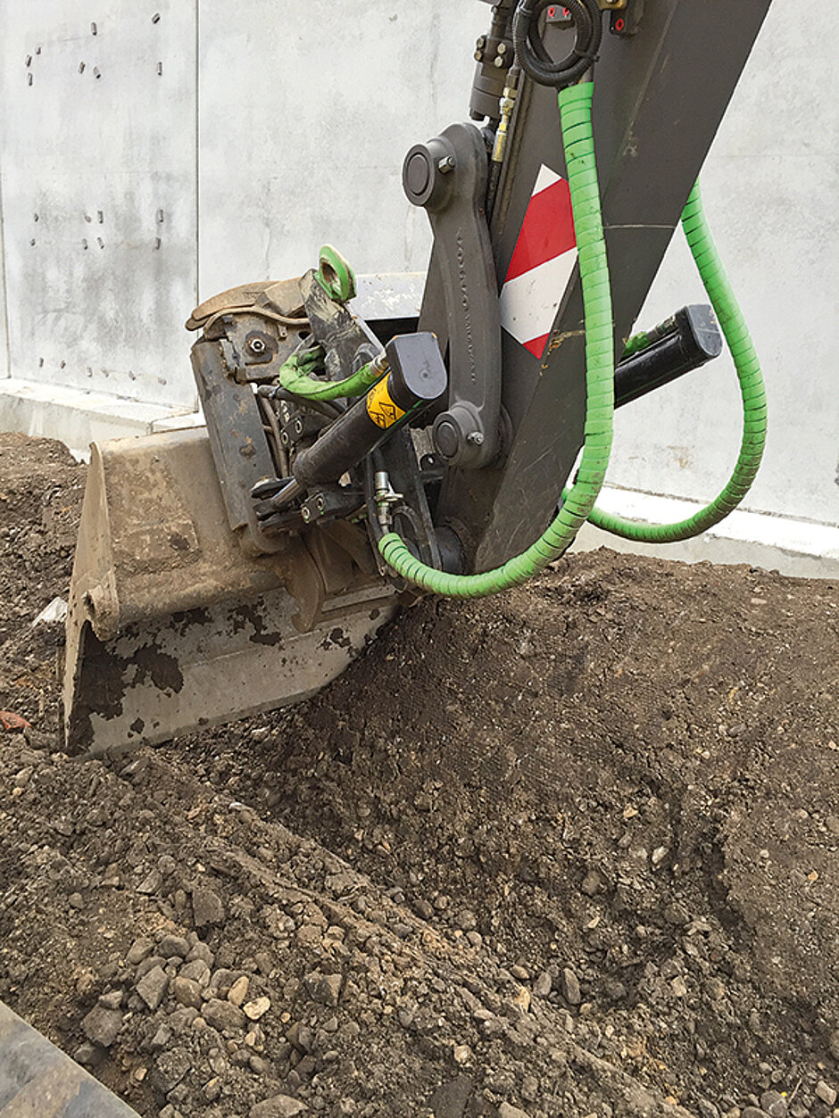 Aufgrund der veränderten Arbeitsweise im Vergleich zu einem Bagger mit Standarausrüstung ist eine hohe Schwenkkraft besonders wichtig. Ob beim Transport von Paletten mit einer Palettengabel oder vor allem beim seitlichen Graben mit einem Tieflöffel – die benötigte Kraft könne, so Steelwrist, nur mit doppeltwirkenden Zylindern erreicht werden. Die Auswirkungen dieser konstruktiven Lösung zeigen sich im Einsatz: Ein häufiges Umsetzen des Baggers ist nicht mehr notwendig, wodurch die Effizienz merklich gesteigert wird.