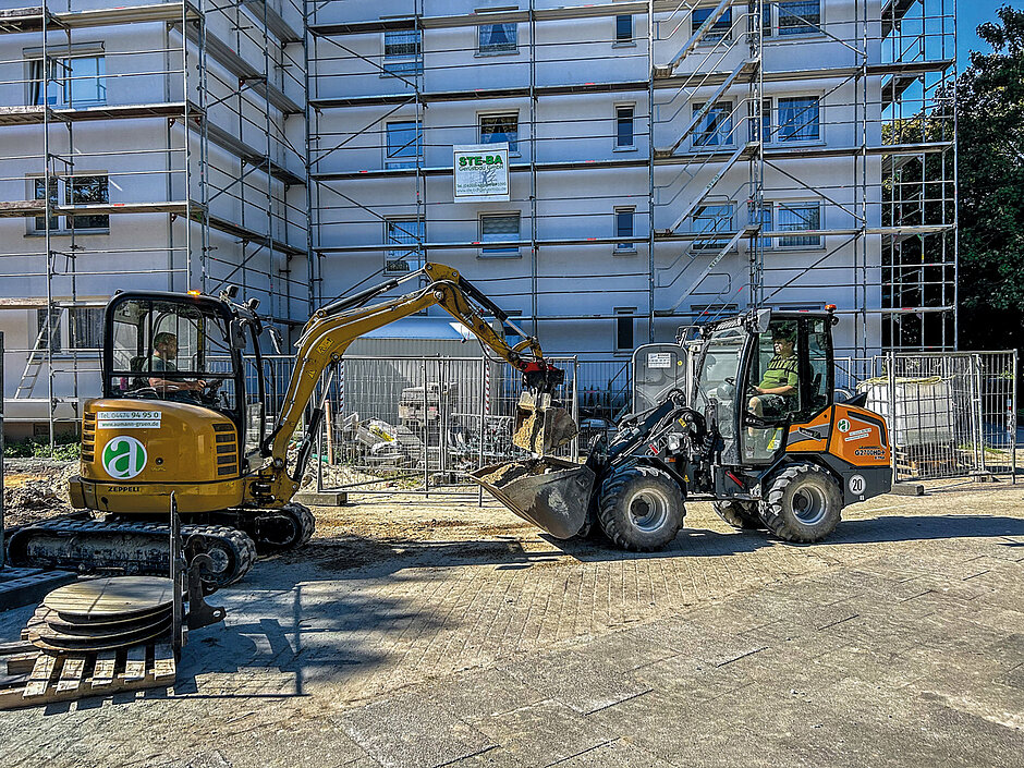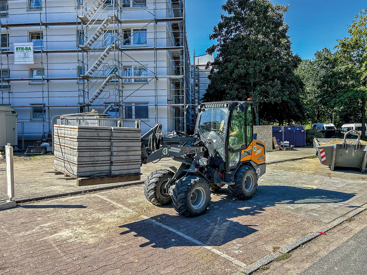 Inzwischen ist der Giant immer dabei, wenn es bei der aumann:grün AG Pflasterarbeiten zu erledigen gibt, so wie aktuell bei der kompletten Neugestaltung der Außenanlage eines Mehrfamilienhauses in Bremen. Hier erledigt der Giant den Aushub mit seiner laut Peters »angemessen großen Schaufel« und transportiert ihn zügig weg. Ebenso bringt er Material und Pflastersteine auf kompletten Paletten dorthin, wo sie gebraucht werden. Michael Peters: »Bisher mussten wir immer ein paar Lagen von Hand herunternehmen, bevor die Palette verfahren werden konnte. Das kostete nicht nur wertvolle Zeit unserer Mitarbeiter, sondern oft auch die Nerven des Vorarbeiters. Beides schont der Giant und sorgt dafür, dass wir insgesamt schneller mit unseren Projekten vorankommen.« So sind beim Giant in den vergangenen beiden Jahren schon einige Betriebsstundenzusammengekommen, in denen der G2700 X-TRA HD+ viele Herausforderungen gemeistert hat, ohne dass nennenswerte Probleme aufgetreten sind. Durch die erwiesene Qualität und die beschriebenen Fähigkeiten wird auch der nächste Radlader, der bei der aumann:grün AG turnusgemäß ausgemustert wird, durch eine Giant-Maschine ersetzt, man bleibe nun bei dieser Marke.d