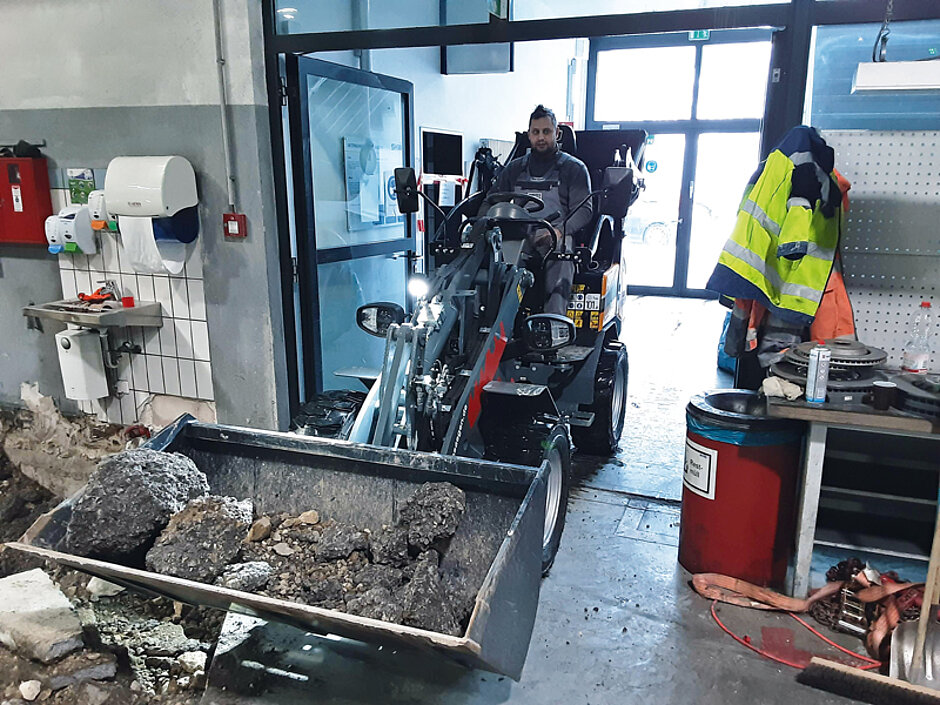 Bei Kiesel in Kirchen-Hausen hat das Unternehmen kürzlich zusätzlich einen Giant-Elektroschaufellader 2200E erworben, um überhaupt einen Kundenauftrag im Untergeschoss eines Firmengebäudes emissionsfrei unter beengten Verhältnissen erfüllen zu können. Der Giant 2200E ist damit eine ideale Ergänzung zu den vorhandenen Arbeitsgeräten. Der flexible Niederländer benötigt lediglich eine Einfahrtshöhe von 2,05 m (bei abgeklapptem ROPS/FOPS-Schutzdach) und eine Einfahrtbreite von rund 1,4 m.