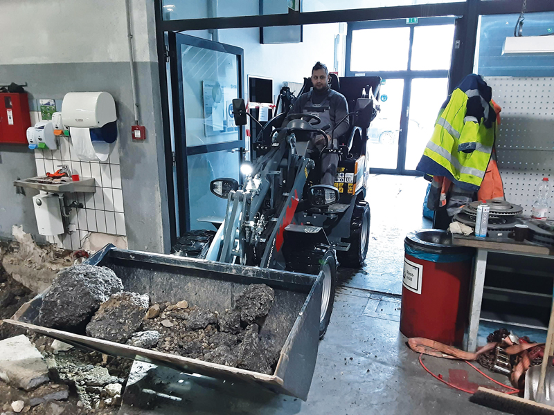 Bei einem Gewicht von rund 2 200 kg und einer Nutzlast von 1 500 kg konnte die Baumaßnahme viel effektiver als beispielsweise mit einem Elektrostapler bewerkstelligt werden. Für den Auftrag musste ein 160 m langer und 80 cm breiter Bodenkanal im Keller gesägt, zerkleinert, ausgebaut und mit dem Elektrolader abtransportiert werden. Danach wurde der entstandene Kanal für die Verlegung von neuen Wasserleitungen mit dem Brokk 160 ausgehoben und das Material nach draußen transportiert. Auch das Einsanden bzw. Wiederverfüllen der neu verlegten Rohre war mit dem Elektrolader schnell erledigt. t