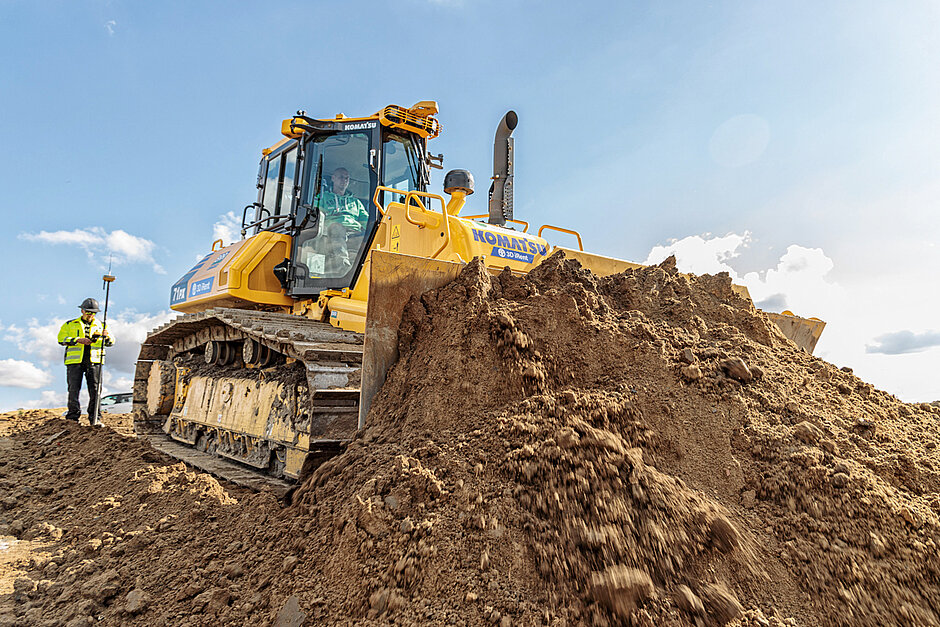 Für diese Arbeit wird eine Komatsu-Raupe D71 mit der neuen MC-Max-Maschinensteuerung von Topcon eingesetzt. »Unser Topcon-Servicepartner Marc Landwehr von AP Deutschland hat uns diese Maschine vermietet und diese brandneue Maschinensteuerung oben draufgesetzt«, betont Vent. »Marc meinte, die sollen wir unbedingt mal ausprobieren. Er hatte recht! Diese Steuerung reagiert sehr schnell, gerade auch an den steilen Böschungen.«