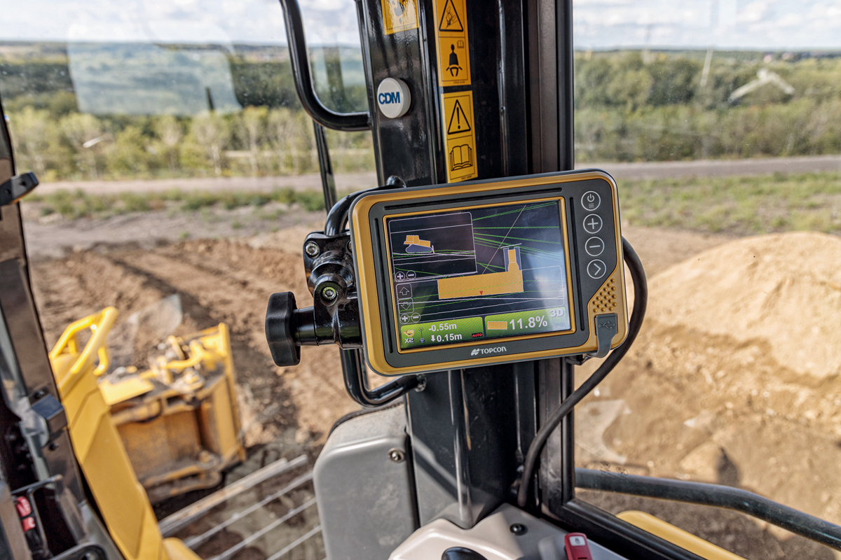 Die zwei gewohnten Stangen rechts und links sucht man hier vergebens. Anders als bei konventionellen Maschinensteuerungen sind die Antennen fest verbaut. Dadurch bleibt die Sicht auf das Schild frei und die Kabelführung zur Motorhaube entfällt komplett. »Das neue MC-Max-System erkennt durch seine Sensoren viel besser, wie die Maschine läuft und wie sie in Querneigung liegt, als das Zweimastsystem. Und auch in puncto Sicherheit und Langlebigkeit hat dieses System die Nase vorn«, erläutert Landwehr. »Diese Topcon-Maschinensteuerung wird sich durchsetzen. Unsere Kunden intensiv darauf zu schulen wird eines der Angebote unseres neuen Schulungszentrums ›iAcademy‹ sein, das wir in diesem Jahr in Herne eröffnen.«