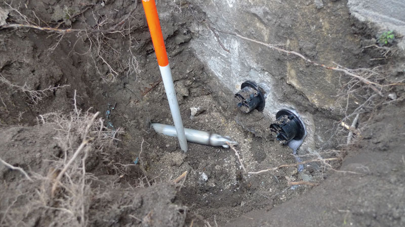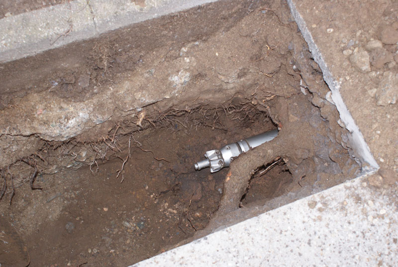 Die Hauptleitung wurde schon ein Jahr vorher in den gepflasterten Bürgersteig verlegt, TRENCH PROJECT durfte die Anschlussstelle selbst bestimmen. Das Pflaster wurde an der vorgesehenen Stelle für eine 60 cm tiefe und nur 50 cm schmale Baugrube wieder aufgehoben und die Baugrube von Hand ausgehoben. Die Breite des Bürgersteigs entsprach genau der Länge der Erdrakete, so dass sie aus der Grube ausgerichtet und gestartet werden konnte. Während der Vorarbeiten wird die kürzeste Trasse festgelegt und auf Fremdleitungen überprüft. Längenabhängig waren Zwischengruben erforderlich, in der die Erdrakete neu gestartet wurde. Unterdessen wurde die Mauerdurchführungen erstellt. Dazu wurde die Kellerwand durchbohrt, die Mauerdurchführung eingeschoben und mit einem Spezialharz abgedichtet. Die Erdrakete erreicht nur wenige Minuten nach ihrem Start das Kopfloch vor der Kellermauer. In diesem Fall waren es 16 m. In dem sandig-lehmigen Boden stand das Bohrloch und fiel nicht ein. Nach dem Rückzug der Erdrakete konnte deshalb die Micropipes ohne Hilfsmittel durch die Bohrung und Mauerdurchführung eingeschoben werden.