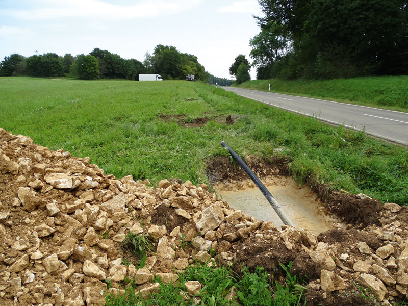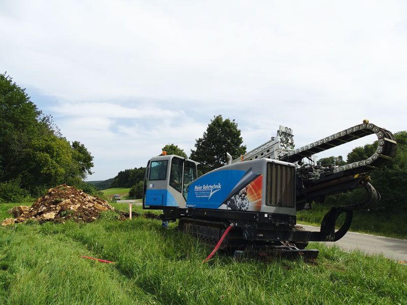 Die Untere Naturschutzbehörde im Landkreis Reutlingen hatte schon vor vielen Jahren Waldsäume, Wacholderheiden, Kalkmagerwiesen und viele Bereiche mit Lebensräumen seltener Pflanzen und Tieren unter Biotopschutz gestellt. Manche dieser Bereiche, zumeist natürliche Hecken und Waldsäume, erweckten bei der Begehung im Gelände den Eindruck von „Unland", also von wenig nutzbaren Vegetationsstreifen. Diese Biotopräume sind jedoch Rückzugsorte von selten gewordenen Tieren und Pflanzen und durften keinesfalls durch offenen Leitungsbau beeinträchtigt werden. Somit kam hier nur der grabenlose Leitungsbau mittels HDD-Bohrtechnologie infrage. Für die HDD-Bohrstrecken von insgesamt fast 1 km Länge in diesen wertvollen Naturräumen wurde die Firma Maier Bau aus Dettighofen beauftragt. Aufgrund kleinster Schürfgruben am Rand der Natursäume war bekannt, dass massiver Fels schon in wenigen Dezimeter Tiefe anzutreffen war. Zum Teil waren kantige Felsbrocken und Felsplatten im Verwitterungsboden bereits dicht unter der Erdoberfläche anzutreffen, teilweise ragten kleine Felsköpfe sogar aus der Erdoberfläche heraus. Für die Bohrarbeiten zur Leerrohrverlegung zur späteren Aufnahme der Glasfaserbündel in 1 bis 1,6 m Tiefe kam daher nur der Einsatz einer GRUNDODRILL18ACS-Bohranlage infrage, schließlich musste in diesem harten Fels mit Druckfestigkeiten bis 230 MPa der grabenlose Leitungsbau sicher und in einem kurzen Zeitraum bewältigt werden. Umso besser und leistungsfähiger muss deshalb das Bohrgerät und der den Fels durchörternde Bohrkopf sein, um in solch einem Hartgestein gute Tagesleistungen zu erzielen. Als Tagesziele waren zumeist Bohrabschnittslängen von 140 m festgelegt worden.