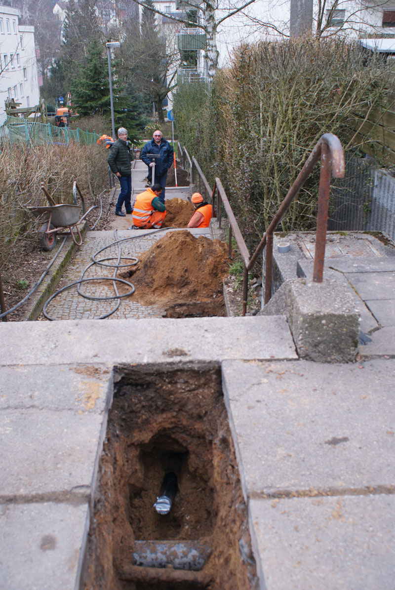 Auch im Gebiet des „Regionalverbands Saarbrücken“, dem zehn Kommunen angehören, gibt es Bereiche, in denen der Breitbandausbau für den schnellen Internetzugang noch fehlt. Hier sind in vielen Teilgebieten von Ortschaften und Stadtteilen die Ausbaumaßnahmen zur Schließung dieser Lücken im Rahmen des „NGA-Netzausbau Saar-Projektes“ sichtbar. So auch in der Landeshauptstadt: In der relativ steilen Hanglage der Richard-Wagner-Straße im Saarbrücker Stadtteil Dudweiler ging es im März 2018 im wahrsten Wortsinn treppauf und treppab, drunter und drüber; Leerrohre für den Einzug von Glasfaserkabeln warteten auf ihre Verlegung. Eigentlich Standard, aber hier machte der Standard eine von vielen Ausnahmen: Der Verlauf der vorgesehenen Trasse für die Glasfaserleitung führte entlang einer ca. 30 m langen, mit Absätzen und Versätzen gegliederten Steintreppe, die beidseits von privaten Grundstücken gesäumt wurde.