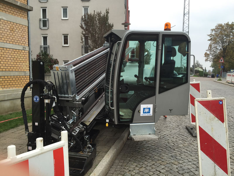Zu seinem ersten Einsatz für M & M kam ein Horizontalspülbohrgerät GRUNDODRILL11XP, der sich aufgrund seiner kompakten Bauweise besonders für Bohrungen im innerstädtischen Bereich eignet. Neben den hier herrschenden engen Platzverhältnissen war der hohe Fremdleitungsbestand eine besondere Herausforderung.