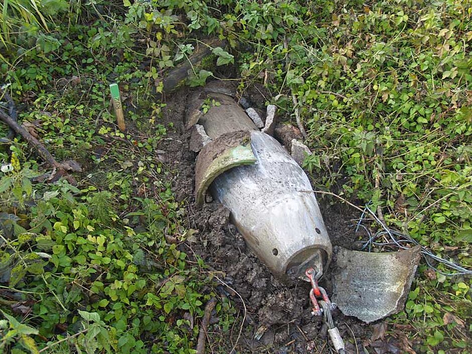 Nach dem »Fehlstart« durch die Wahl der falschen Winde konnte es dann aber nach dem Austausch endlich losgehen: Durch die Spillwinde mit einer maximalen Zugkraft von bis zu 100 kN wurde die Ramme vorgespannt, um die zielgenaue, sichere Führung in der alten Trasse zu gewährleisten und zudem die optimale Einleitung der dynamischen Energie zum Bersten und Aufweiten der besonders widerstandsfähigen alten Beton-Schwerlastrohre zu unterstützen. In einer Tiefe von 4 m arbeitete sich der Grundocrack mit einer Schlagenergie von bis zu 2 860 Nm ohne Probleme durch den zum Damm aufgeschütteten Lockerboden: die Altleitung wurde mit lautem Knacken und Krachen aufgebrochen, die Scherben ins Erdreich verdrängt und der 43 m lange PE-100-RC-Rohrstrang eingezogen. Die reine Berstzeit betrug gerade mal 2,5 Stunden.