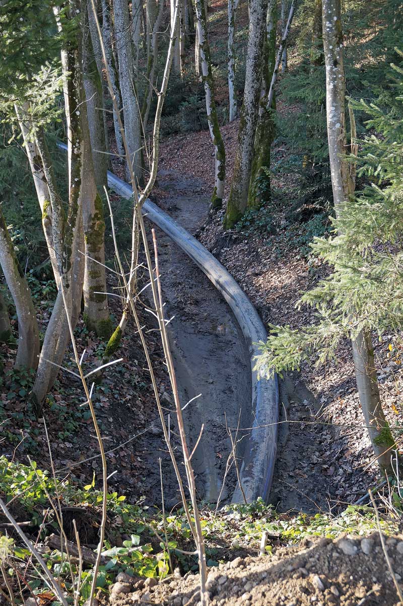 In einem ersten Arbeitsschritt wurden die einzuziehenden Neurohre vorbereitet. Da zum großzügigen Auslegen der Rohre das Bachbett ausreichend Platz bot, entschied sich das Team für den Einzug eines Langrohrs. Dazu wurden die 4 x 12 m langen PE-100-RC-Rohre zu einem Rohrstrang spiegelgeschweißt. Bei dieser Variante des Heizelementstumpfschweißens ist der Schweißspiegel in den meisten Fällen eine mit PTFE (Polytetrafluorethylen) beschichtete Metallfläche und wird zwischen die zu verschweißenden Flächen gelegt; damit wird das Anhaften des Rohres am Heizelement verhindert.
