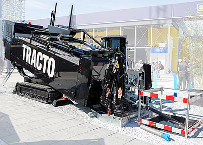 Alles an diesem Bauprojekt ist groß: Die Baustelle „Am Leuchtturm“ auf Norderney hat eine Arbeitsfläche von 14.000 m² und zusätzlich 8.000 m² Lagerfläche. Sie wird von einer 257 m langen und 10 m hohen Lärmschutzwand umgeben. Für den Transport von Material und Geräten sind neben Staplern und Baggern zwei Schwerlastkräne im Einsatz. Die eingesetzten HDD-Großbohranlagen verfügen über eine Schub- und Zugkraft von 250 bzw. 450 t. Die Bohrungen von Norderney aus haben eine Länge von 1.010 m in südlicher Richtung und 1.140 m in nördlicher Richtung. Für das Anmischen und Lagern der Bohrspülung stehen auf der Baustelle sieben Wassertanks mit einem Fassungsvermögen von insgesamt 850 l bereit. Für die Rohrverlegung und die Materialbeförderung vom südlichen Watt aus sind dort zwei riesige Plattformen, sogenannte Pontons, eingeschwommen und verankert. Die Casing-Rohre, durch die die HDD-Bohrungen landseitig starten, haben einen Durchmesser von 800 mm und sind jeweils 24 m lang. Bei diesen Dimensionen wirkt die Taurus-Ramme von Tracto mit einer Länge von fast 4 m und einem Gewicht von 4,9 t beinahe klein.