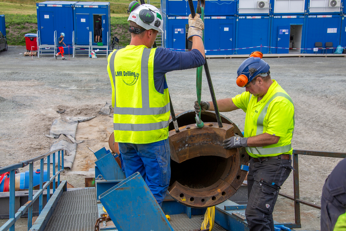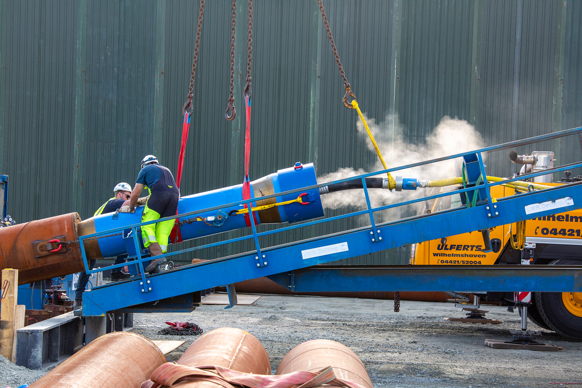 Die Schlagenergie der Rammen hilft aber auch, komplizierte HDD-Bohrungen erfolgreich abzuschließen: Mit diesen sog. HDD-Assist & Rescue Verfahren kann man beispielweise den Rohreinzug mit dynamischer Schlagkraft unterstützen, festsitzende Bohrgestänge lösen oder, wie hier auf Norderney, Casing-Rohre für HDD-Bohrungen einrammen – Fachbegriff ‚Conductor Barrel‘. Der dynamische Rohrvortrieb funktioniert zuverlässig und zielgenau, weil die Ramme direkt mit dem vorzutreibenden Stahlrohr schubfest verbunden und axial dahinter ausgerichtet ist. Die Verlegegenauigkeit ist auch der entscheidende Faktor beim Einsatz des Taurus auf Norderney: „Es ist sehr wichtig, dass die Casings genau eingebaut werden, damit die Bohrungen ordnungsgemäß ausgeführt werden können“ erklärt LMR-Projektleiter Jorn Stoelinga.