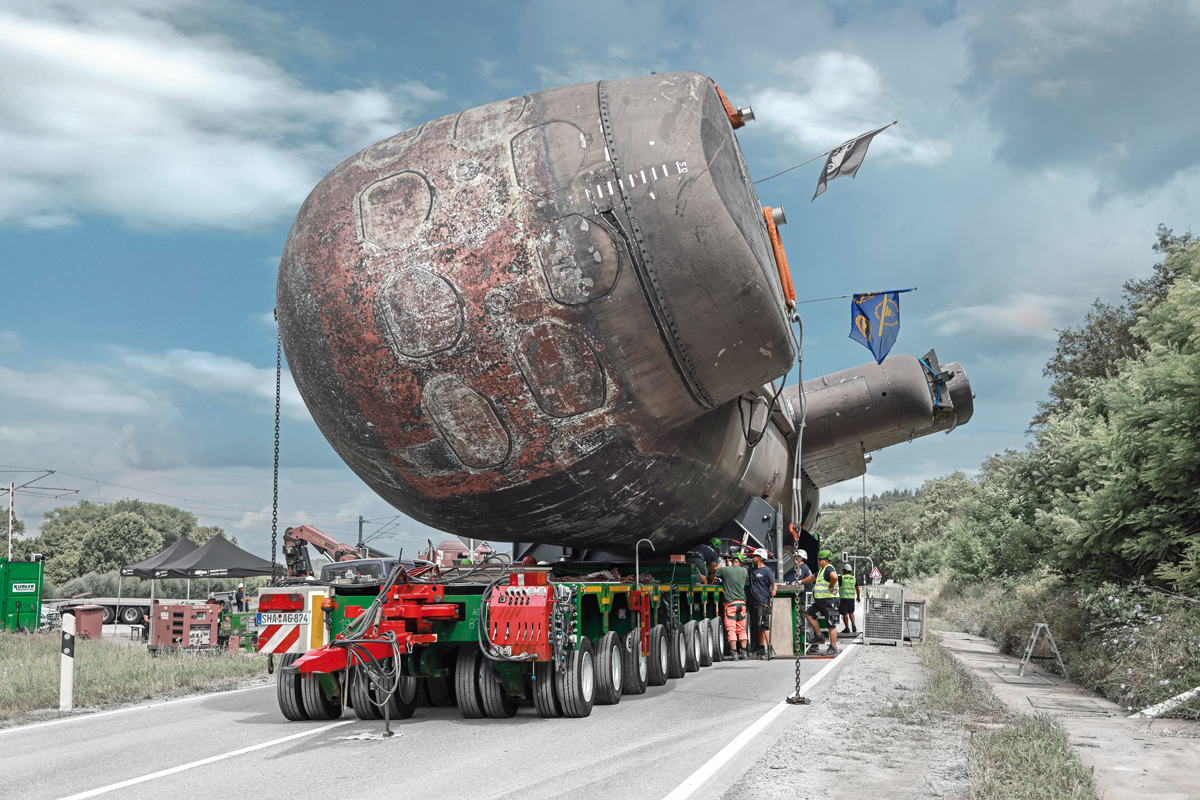 Nicht ohne Grund wies der sehr erfahrene Schwerlastexperte auf die bevorstehende Herausforderung hin. Die Strecke hat es in sich und führte durch den hügeligen Kraichgau im Nordwesten von Baden- Württemberg. Vor Neckarmühlbach wartete die erste große Herausforderung: die Unterquerung eines Zement-Förderbandes. Dazu musste U17 zum ersten Mal auf dem Tieflader in der speziellen Drehvorrichtung hydraulisch geneigt werden. Nach der Generalprobe auf dem Wasser gelingt auch die Weltpremiere zu Lande, auch dank der robusten Transportausrüstung von TII Scheuerle. »Für einen solchen Transport benötigen wir qualitativ hochwertige, robuste und präzise lenkbare modulare Achslinien. Wir arbeiten schon seit 35 Jahren mit TII Scheuerle zusammen und sind von den Qualitäten der Fahrzeuge überzeugt«, erläuterte Frieder Saam.