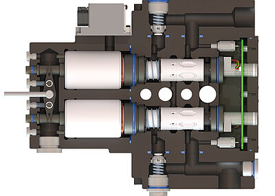 Einfach gesagt, werden beim Aufbau des RPP der Steuerblock und das Außenteil der Drehdurchführung (Rotor) zu einem Teil zusammengefasst. Das Innenteil der Drehdurchführung wird dann wie gewohnt in diese Kombination eingefügt, um die Fluidübertragung zu ermöglichen. Dabei entfallen zahlreiche vorher benötigte Anschlussgewinde. Bei Drehdurchführungen von drei bis fünf Kanälen wird das Konzept bereits verwendet. Ein weiteres Potenzial zur Reduzierung der Schnittstellen wird durch den kundenspezifischen Aufbau des Steuerblock-Rotors ermöglicht. Hier können Zusatzfunktionen integriert werden, die sich sonst wie ein Netz kleiner Ventil- bzw. Funktionsblöcke im System verteilen.