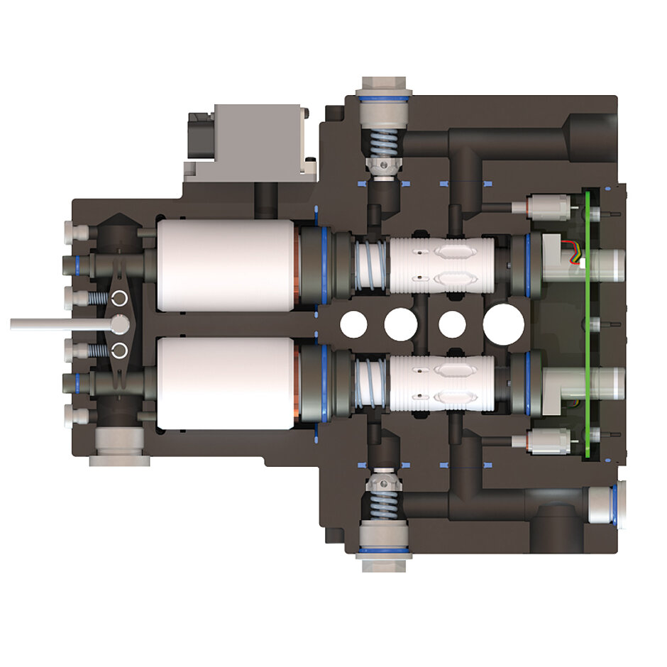 Einen Ausweg aus dem Eins-plus-Eins von Einzelkolben samt einhergehenden Drossel- bzw. Leistungsverlusten sowie größeren Ausmaßen verspricht die Doppelkolbenventiltechnik, deren zwei unterschiedlich gestaltete Kolbensteuerkanten unabhängig voneinander gesteuert werden können. Da sich der Zu- und Ablauf auf die Anwendung anpassen lässt und nicht vom Kolben eingeschränkt wird, können mit einem auf zwei Kolben aufgeteilten Design alle erforderlichen Funktionen dargestellt werden. Dank der freien Zu- und Ablaufsteuerung der Ventile ist praktisch jede Funktion autark. Miteinander parallel in Stufen verschaltet, lassen sich – mit weniger Ventilen und Bauteilen als bisher – auch komplexe hydraulische Prozesse umsetzen.