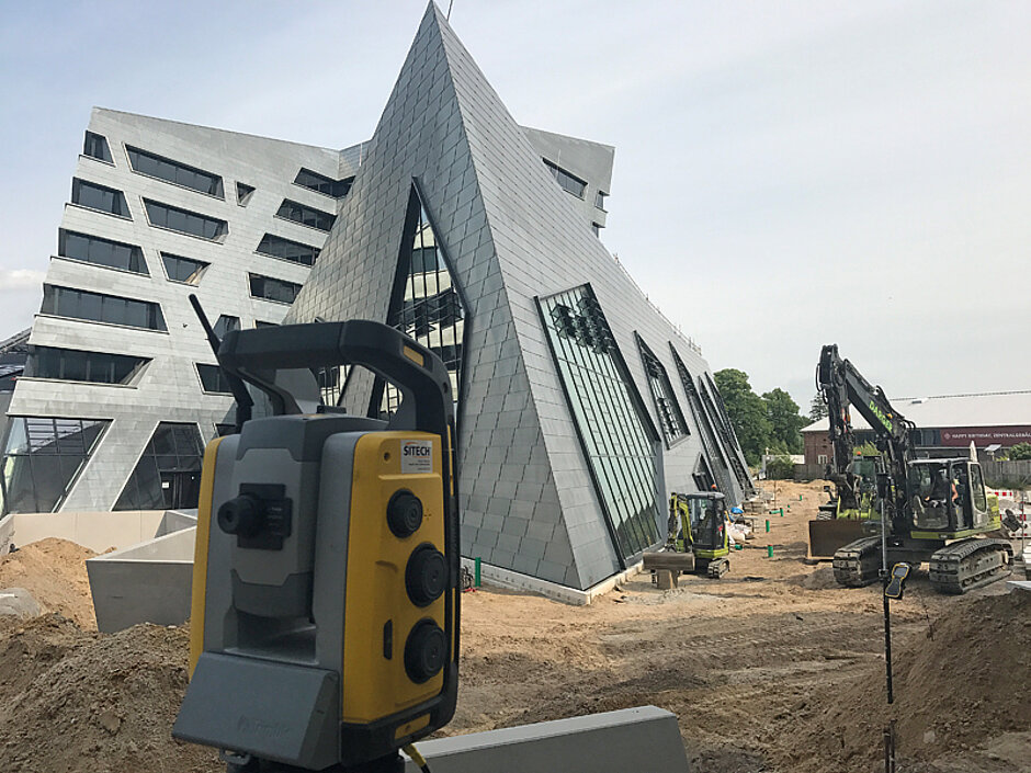 Ganz anders stellt sich die Situation auf den beiden anderen Seiten des Baukörpers dar. Wegen des Gebäudeüberhangs sind diese abgeschattet und es können keine Satellitendaten empfangen werden. Im besonderen Maße profitiert das Unternehmen an der Stelle von dem Trimble-Prinzip, dass alle Systeme modular und flexibel gestaltet sind. So kann ein entsprechend vorgerüsteter Bagger vom Dual-GNSS-Betrieb schnell auf UTS-Einsatz umgerüstet werden. Überdies kann mit der UTS nicht nur der Bagger gesteuert werden, sondern sie eignet sich auch zur hochgenauen Bauvermessung. So entschloss sich das Unternehmen zur Steuerung des Baggers über eine Trimble UTS-Totalstation als Alternative. Die Trimble-UTS-Totalstation liefert der Maschinensteuerung 20 Mal in der Sekunde aktuelle Positionsdaten.