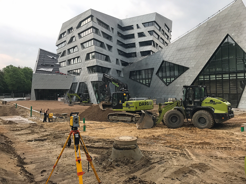 Vor dem Hintergrund des ungewöhnlichen Baukörpers bestimmen unterschiedliche Strategien die technische Herangehensweise der Firma Franz Darger. Um die anspruchsvollen Vorgaben des Auftraggebers einzuhalten, konnten mit dem Trimble-Satelliten-Roverstab SPS985 das Urgelände aufgenommen und weitere Berechnungen an Ort und Stelle durchgeführt werden. Die Nutzung aller verfügbaren GNSS-Signale steht für effizientes und produktives Arbeiten. Der Trimble SPS985 eignet sich für den Einsatz auf kleinen und großen Baustellen als auch als Wi-Fi-fähige Basisstation für andere GNSS-Anwendungen wie zum Beispiel zur Maschinensteuerung.