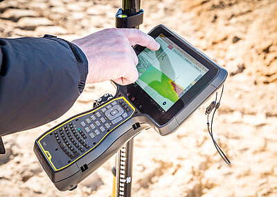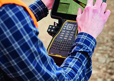 Das schlanke und robust ausgelegte Tablet T100 mit optimiertem Bedienkonzept arbeitet nahtlos mit den Trimble-Baustellenpositionierungssystemen und der Trimble-Siteworks-Software zusammen.
