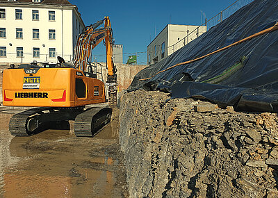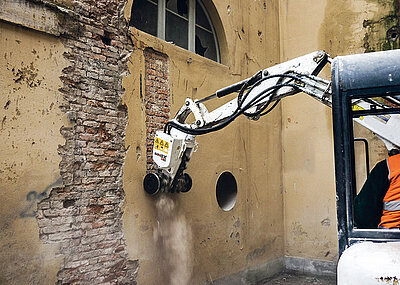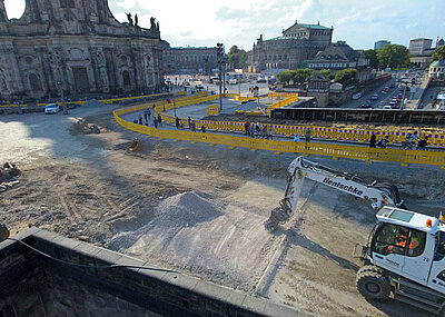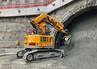 »Für den erschütterungsfreien Abtrag von Betondecken sind Kaltfräsen die ideale Lösung. Die Präzision erreichen wir mit der passenden 3D-Steuerung«, sagt Bernhard Fischer, Leiter der Leipziger Kutter-Niederlassung. In diesem Fall war der 40 cm dicke Betonaufbau in zwei bzw. drei Lagen mit Dübeln und Ankern verstärkt. Das Betonfräsen erledigte Kutter in mehreren Übergängen. Die Frästiefe richtete sich dabei nach der Position von Dübeln und Ankern. »Um ein vollständig betonfreies Planum zu übergeben, haben wir überall 42 cm abgetragen«, sagt Matthias Dreer, der für Kutter den Einsatz der 15 Großfräsen, die über mehrere Wochen im 2-Schicht-Betrieb arbeiteten, koordinierte.