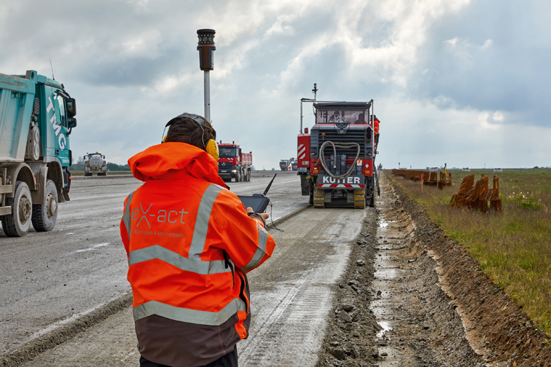 In puncto Vermessungstechnik setzte Kutter beim 3D-Projekt in Leipzig/Halle auf Systempartner: »Wir erhalten die Solldaten von den Auftraggebern. Auf der Baustelle arbeiten wir dann immer zusammen mit einem lokalen Dienstleister von Sitech«, berichtet Matthias Dreer. Am Flughafen Leipzig/Halle war das Vermessungs-Team von ex-act aus Zwickau als Partner von Kutter in Zusammenarbeit mit Sitech im Boot. Sie kümmerten sich um das Einmessen der Totalstationen, die Installation der Komponenten vor Ort und die Kontrolle der Höhenlage hinter der Fräse. Dazu vermietet Sitech die Geräte und stellt für das Projekt die passende Technik in der geforderten Anzahl zur Verfügung. Das ist möglich, weil Trimble für das Fräsen dieselben Komponenten einsetzt, wie sie weltweit auch in Baggern, Gradern und anderen Baugeräten erprobt und verfügbar sind.