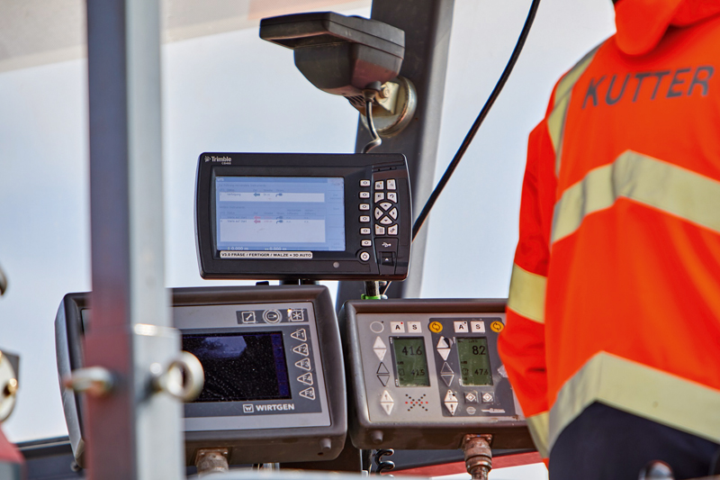 Der letzte Fräsübergang war entscheidend für die Qualität, denn dabei mussten die Fräsen eine entsprechend texturierte Fläche in der vertraglich vereinbarten Höhenlage hinterlassen. Gefräst wurden die untersten 4 cm bis 6 cm Beton und ca. 2 cm der darunterliegenden HGT mit einer Standardfräswalze. Für die Nivellierung setzte Kutter ein 3D-System von Trimble ein. »Mithilfe dieser Steuerung können wir den Fahrbahnbelag so präzise abtragen, dass der Betonfertiger später auf der Fräsfläche lagegetreu einbauen kann. Ausgleichsschichten sind dann nicht mehr nötig. So sparen unsere Kunden viele Baustoffe und natürlich auch Kosten«, erklärt Matthias Dreer.