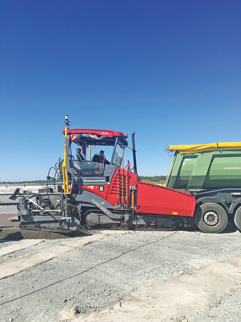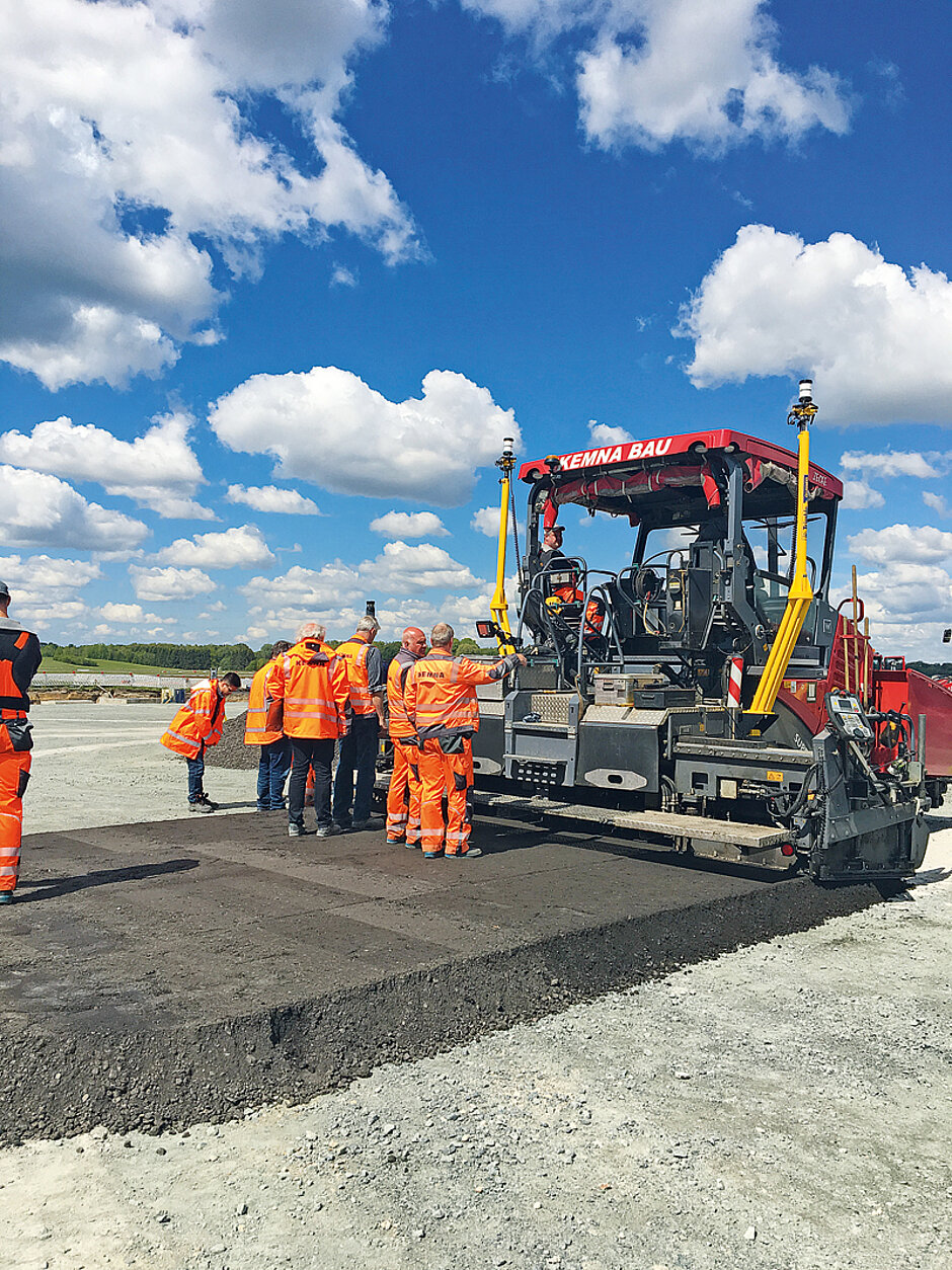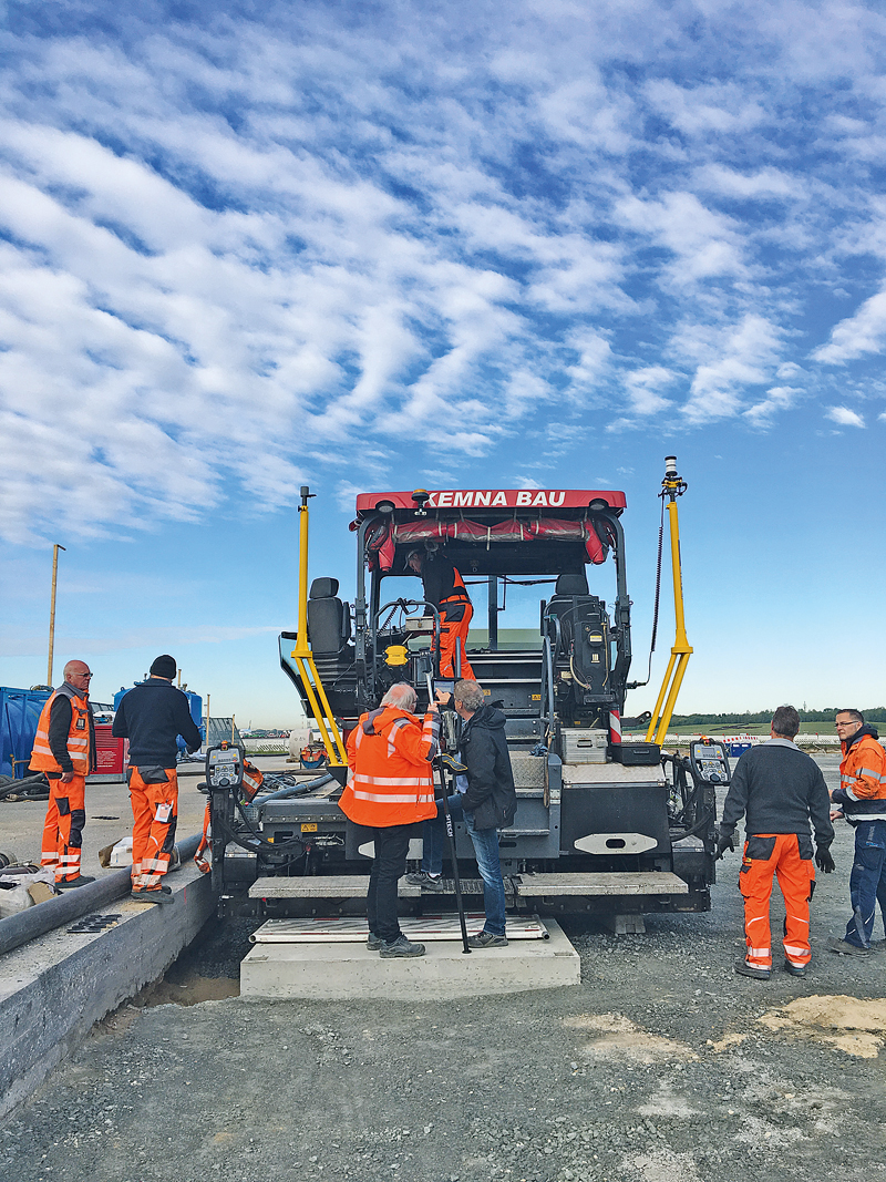 Bereits der Einbau der darüberliegenden hydraulisch gebundenen und 20 cm starken Tragschicht (HGT) erfolgte mittels 3D-gesteuerten Vögele-Asphaltfertigern des Typs Super 1800-3. Mithilfe der Trimble-Fertigersteuerung PCS900 und Universaltotalstation (UTS) konnte Kemna Bau die Schicht zeitsparend in einem Arbeitsgang mit hoher Präzision im Millimeterbereich einbauen. Nacharbeiten konnten vermieden und der Materialeinbau präzise, gemäß der Anforderungen, realisiert werden. Schließlich konnte die 34 cm dicke Asphaltbefestigung materialsparend fertiggestellt werden, weil der Unterbau wegen der hohen Präzision der 3D-Steuerung keine Bodenunebenheiten aufwies. Gleichzeitig wurden die hohen Anforderungen an die Qualität der Asphaltoberfläche erfüllt; das notwendige Gefälle durfte maximal 1 % betragen.