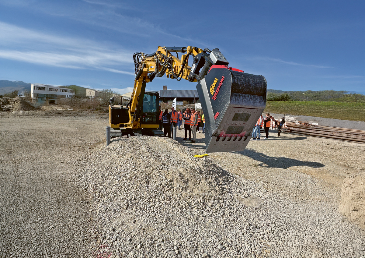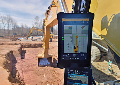 An einer weiteren Station konnten die Besucher der »Bau(ma)stelle« u. a. den Speziallöffel von RodRadar inspizieren: Die »Live Dig Radar«-Technologie (»LDR«) ermöglicht Echtzeit-Erkennung von unterirdischer Infrastruktur und verhindert so nicht nur eine Beschädigung, sondern in Folge auch kostspielige Verzögerungen im Ablauf. Beim Arbeiten mit dem »LDR« bekommt der Fahrer ein Signal, sobald der Bereich mit der Schaufel gescannt wird und sich ein Hindernis unter dem Baggerlöffel befindet. Dabei erkennt die Radartechnik nicht nur metallische Leitungen, sondern auch nicht metallische Einbauten wie beispielsweise Rohre aus Kunststoff oder Strukturen aus Beton. Die Anzeige des »LDR« ist in die Maschinensteuerungsplattform »Trimble Earthworks« integriert, die über weitere Assistenzsysteme wie eine 3-D-Automatik, Augmented Reality oder die Hub- und Schwenkbegrenzung »LogPos« von Lotronics verfügt. Letztere sorgt dafür, dass die damit ausgestattete Maschine stoppt, bevor in einen vorher definierten »verbotenen« Bereich geschwenkt wird. So können Sach- und Personenschäden verhindert und die Sicherheit bei Baggerarbeiten gesteigert werden.
