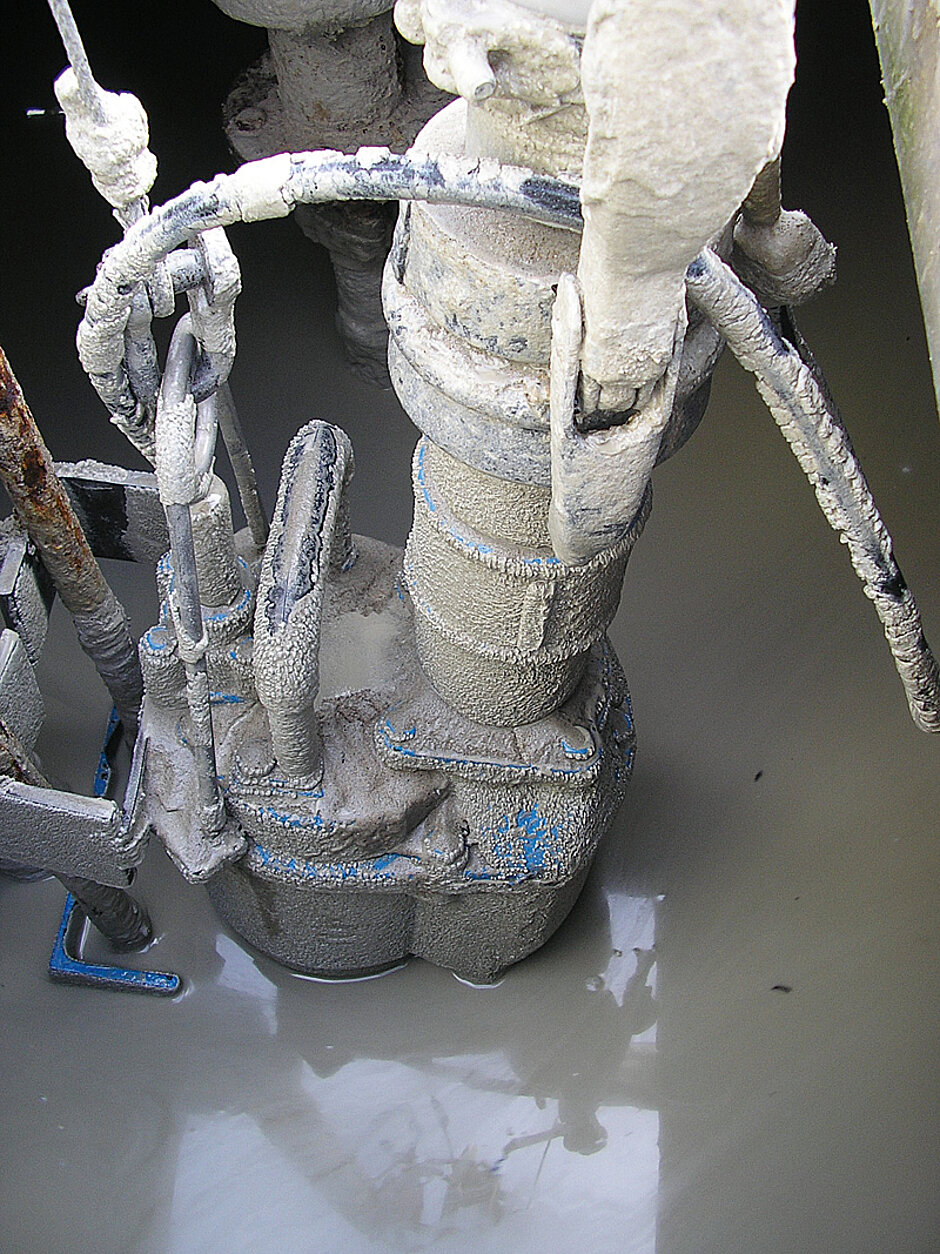 Beim Beton-Recycling hingegen geht es um Restwasser, das mit Zement- oder Betonresten verunreinigt ist. Diese können Korngrößen im Mikrometerbereich annehmen, aber auch kernige Brocken bis 30 mm enthalten. Im Wasserbad werden die größeren Teile herausgesiebt. Das Restwasser mit Zementkörnern und anderen Feinstoffen wird zum Ausspülen von Fahrmischern genutzt oder gelangt über das Zugabewasser in die Produktion zurück. Tsurumi bietet mit KTZ, KRS und UZ drei Reihen, die sich für hartes Recycling-Wasser eignen. Darunter die KRS2-80 für bis zu 100 m³/h Fördermenge und knapp 16 m maximaler Förderhöhe. Die KRS2-Serie zeichnet sich insbesondere durch kraftvolle Rührwerke an der Einsaugöffnung aus, um Medien mit hohem Feststoffanteil fließfähiger zu machen.