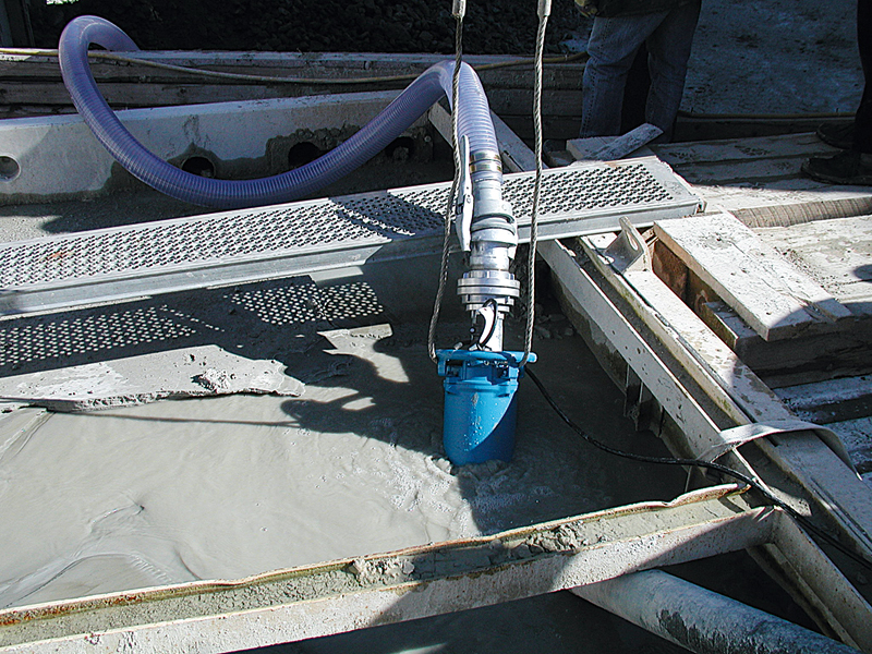 In der Verarbeitung fertiger Betonelemente geht es meist um Klar- bzw. Brauchwasser zum Kühlen von Bohr- und Sägemaschinen. Tsurumi bietet beispielsweise die in Fußballgröße gehaltene und 3,4 kg wiegende Minipumpe Family-12 an. Mit 100 W Motorleistung schafft sie 80 l/min, fördert bis zu zwei Stockwerke aufwärts und soll selbst bei körnigem Schmutz (6 mm freier Durchgang) nicht aufgeben müssen. Wer mehr benötigt, sollte, so die Meinung von Tsurumi, das größere Schwestermodell LSC nutzen: ebenfalls ein Flachsauger, aber mit 170 l/min und 11 m Höchstförderhöhe.