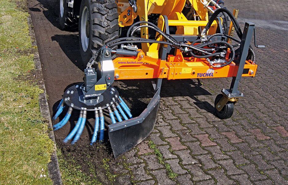 Wie bei allen Tuchel-Anbaumaschinen werden die Kehrmaschinen an die individuellen Bedürfnisse angepasst, Zubehör wie Wassersprüheinrichtung oder auch Seitenbesen stehen zur Auswahl. t