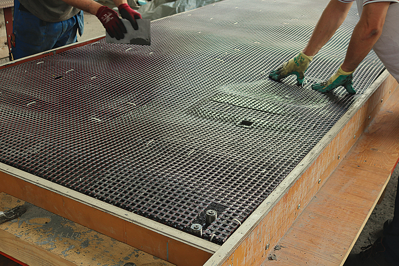 Werden die Betonbauteile im Fertigteilwerk hergestellt, müssen sie nach der Herstellung auf die Baustelle gebracht werden. Je leichter sie sind, desto weniger Treibhausgase fallen bei ihrem Transport und ihrer Montage an. Ein weiterer Pluspunkt der Bewehrung ist, dass auch sie selbst um ein Vielfaches leichter und wesentlich dünner als üblicher Armierungsstahl ist. Das kann beispielsweise den Vorteil mit sich bringen, dass für eine Baustelle zwei Lkw-Ladungen mit normalem Bewehrungsstahl erforderlich sind, während bei einer Carbonbewehrung nur eine benötigt wird. Dieser Ansatz lässt sich, je nach Situation, auf weitere Logistikaspekte ausdehnen. Beispielsweise können bei einer vorgehängten Betonfassade, je nach Plattengröße, auch weniger Befestigungselemente erforderlich sein oder gar die Dimensionierung der tragenden Gebäudestruktur reduziert werden.