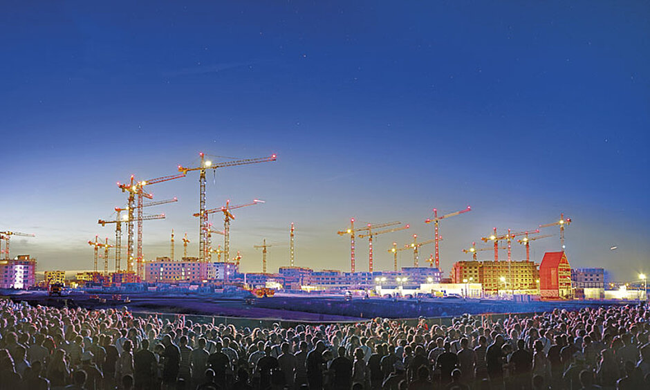 Ein Erlebnis der besonderen Art war vor kurzem in der Seestadt Wiens zu bestaunen. Die Dichte an Turmdrehkranen und ihre Positionierung vor der Wiener Skyline wurden in der Dämmerung für die Zuschauer zu einem faszinierenden Bühnenerlebnis. Rund 40 beleuchtete Turmdrehkrane bewegten sich zu einer musikalischen Komposition, kombiniert mit einem atemberaubenden Lichtspiel.