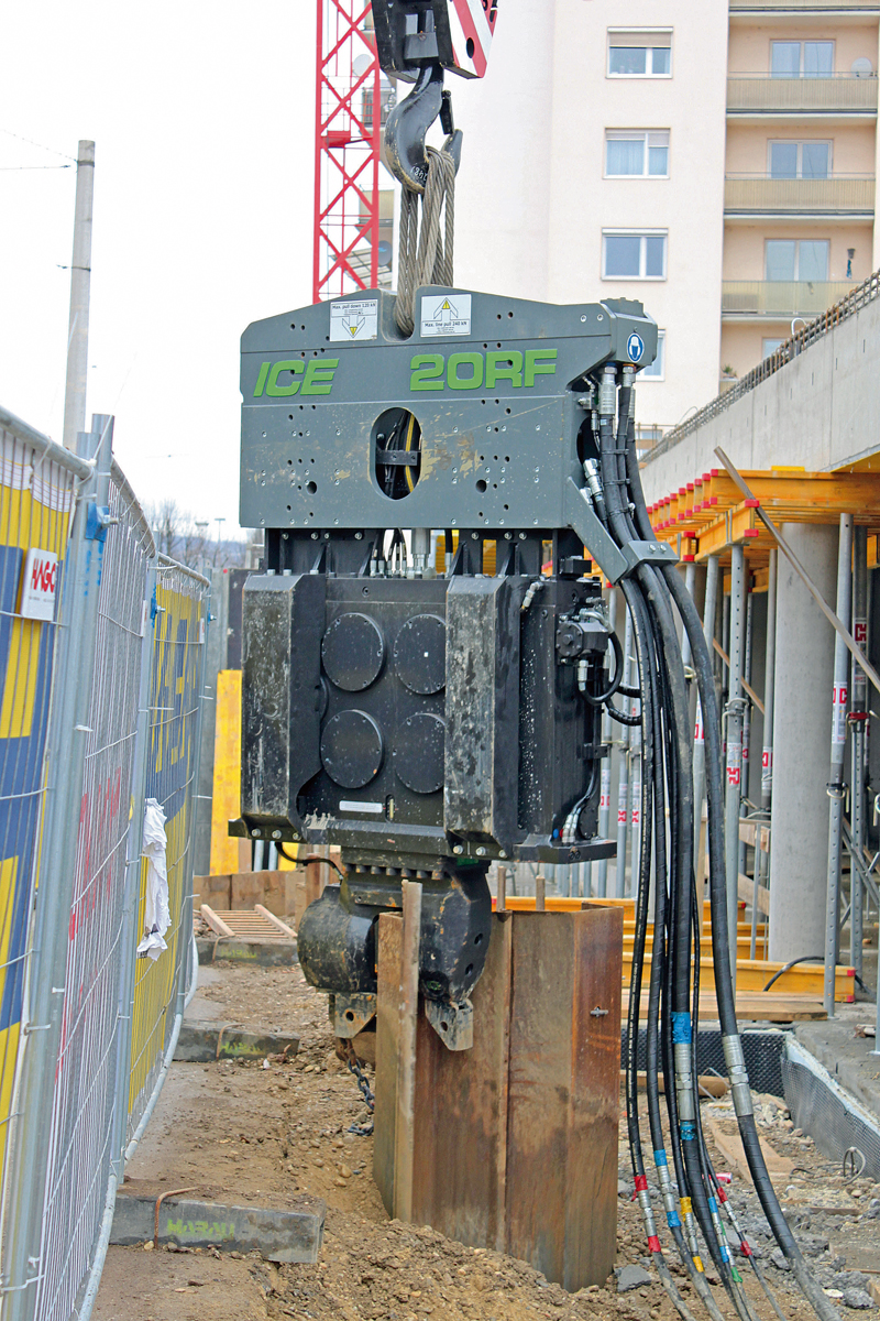 Für die zum Einlassen der großen Rohrgrößen notwendige Strebenfreiheit wurde die Baugrubensicherung durch eine Rückhaltevorrichtung von TWF realisiert. Aufgrund der Rohrdurchlässe und Rohrlängen war es notwendig, die Rollenschlitten zu ziehen und mittels Stahlträgern (hier HEB 500) auf eine Spannweite von etwa 10 m über die Gleitschienen hinweg zu überbrücken. Nach Erreichen der konstruktiven Tiefe und statischer Wirksamkeit der Rückhaltevorrichtung wurden die zwischenliegenden Rollenschienen dann entfernt, um ausreichend Platz für den Einhub des Stauraumkanals zu haben.