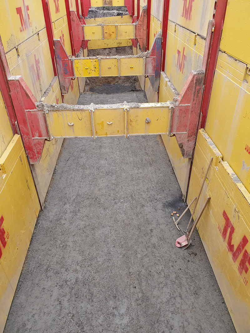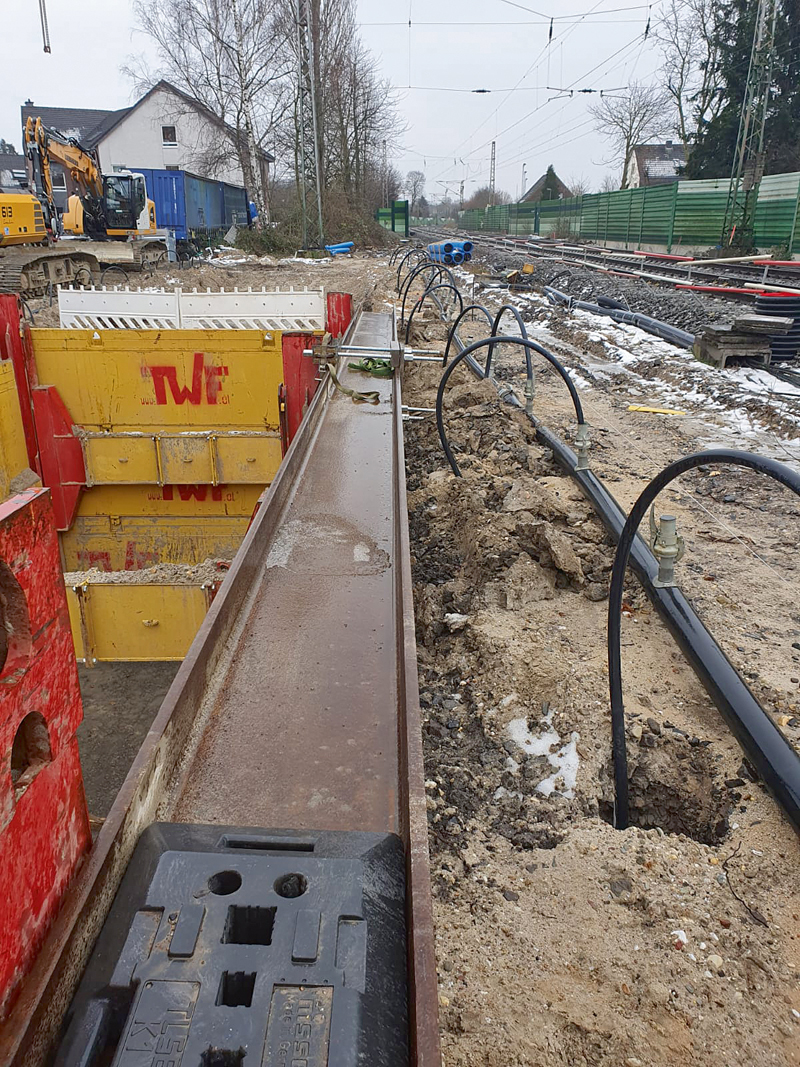 Bei der statischen Umsetzung wurde THG von der TWF Tiefbautechnik unterstützt, einem Spezialisten für Ramm- und Bohrtechnik sowie selbst hergestellter Grabenverbausysteme. Für den Verbau an der Einleitstelle Immigrather Bach wurden Doppelgleitschienen des Heinsberger Spezialisten für Grabenverbausysteme eingesetzt. Die Elemente sind im Absenkverfahren bei nicht standfesten Böden bis zu 6,2 m und Grabenbreiten von bis zu 9 m flexibel einsetzbar.