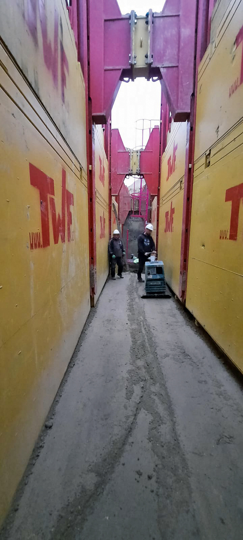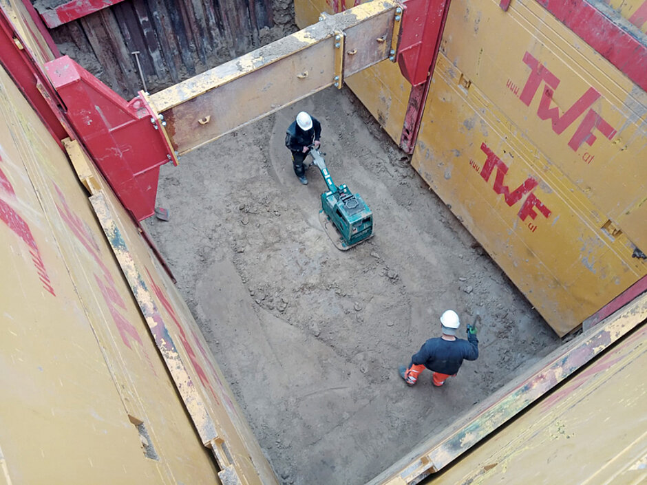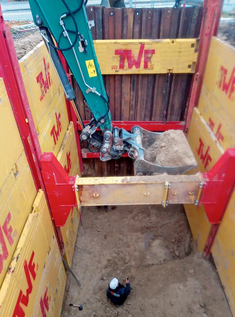 Unter anderem muss die vorhandene Schmutzwasserleitung verlegt werden, um den vorgeschriebenen Abstand zum neuen Gebäude einzuhalten. Zudem entstehen mehrere Schachtbauwerke als zusätzlicher Stauraum für Regenwasser. TWF lieferte seine Doppelgleitschiene XL als Verbau für die Umverlegung der Rohrleitung DN 400 in einer Tiefe von ca. 6,8 m. Gleichzeitig werden zwei Beton-Schächte DN 1000 gegen neue Kunststoffschächte DN 1000 aus PE-HD der Firma Wavin getauscht und an die vorhandene Abwasserleitung angebunden. Dafür setzte das Bauunternehmen Gebrüder Karstens einen Eckverbau – Trägerlänge 6,5 m, 3,5 m umlaufende Platten, verbaute Höhe ca. 6,8 m – aus dem TWF-Programm ein. Dort stößt der Rohrgrabenverbau über eine Länge von 55 m an.