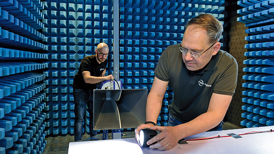Lange Wartezeiten bei externen EMV-Laboren haben dann dazu geführt, dass Tyri in eine eigene, hausinterne Testanlage investiert hat. Seitdem werden sämtliche Prüfungen selbst durchgeführt, um zu sehen, wie gut sich eine elektrische Komponente in einer elektromagnetischen Umgebung verhält, ohne Funkstörungen zu verursachen. Falls bei einem der EMV-Tests Probleme entstehen, wie beispielsweise ein Flackern im Licht, können dank des eigenen Labors wertvolle Entwicklungszeit eingespart und bessere Ergebnisse zu niedrigeren Kosten erzielt werden. Sämtliche Testergebnisse werden zudem detailliert protokolliert.