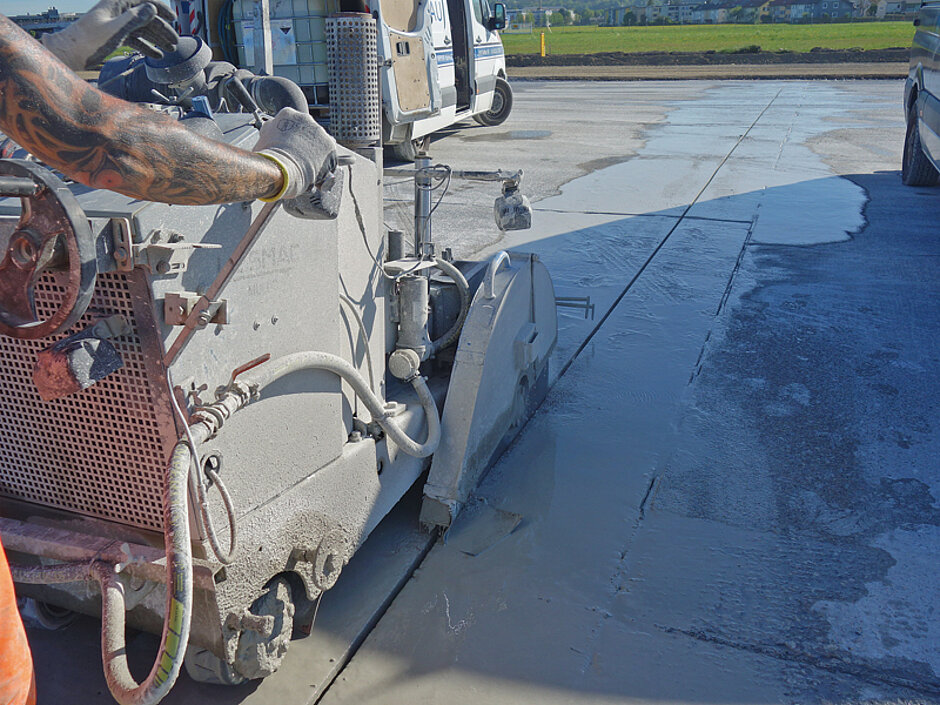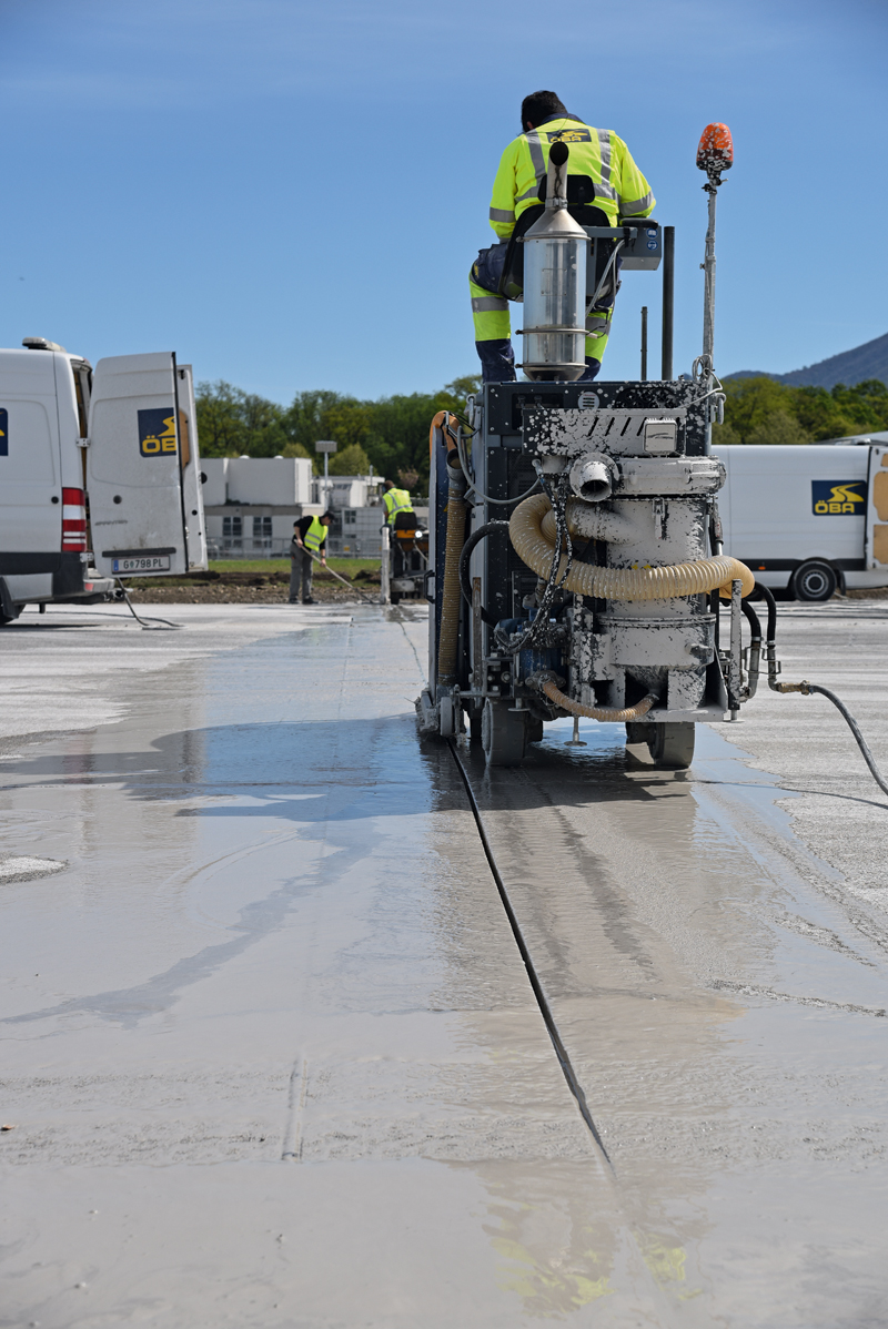 Um die »längste gerade Straße in Salzburg« mit ihren 2 850 m in das 21. Jahrhundert zu bringen, sollte sie so saniert werden, dass die bestehende Betondecke erhalten bleibt, und dadurch 4 000 Lkw-Fahrten mit Abbruchmaterial eingespart werden. Mittels Fallbeil wurde die 45 m breite Rollbahn deshalb in einzelne Betonschollen unterteilt und so zu einer spannungsfreien Trageschicht umgewandelt. Im Vorfeld mussten dazu im über 60 Jahre alten Beton insgesamt 10,8 km Fugenschnitte von mindestens 15 mm Stärke und 300 mm Tiefe eingebracht werden, was 240 Querschnitten à 45 m entspricht.