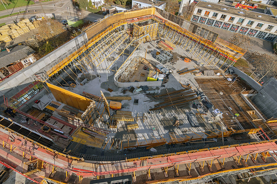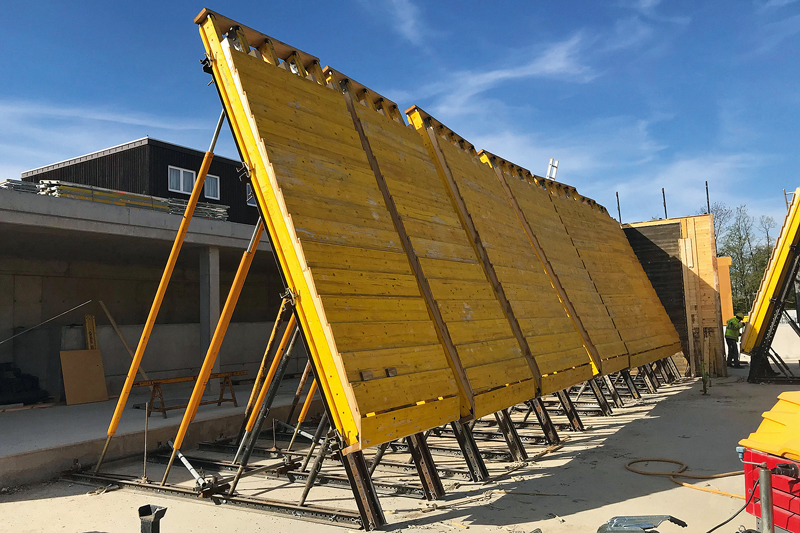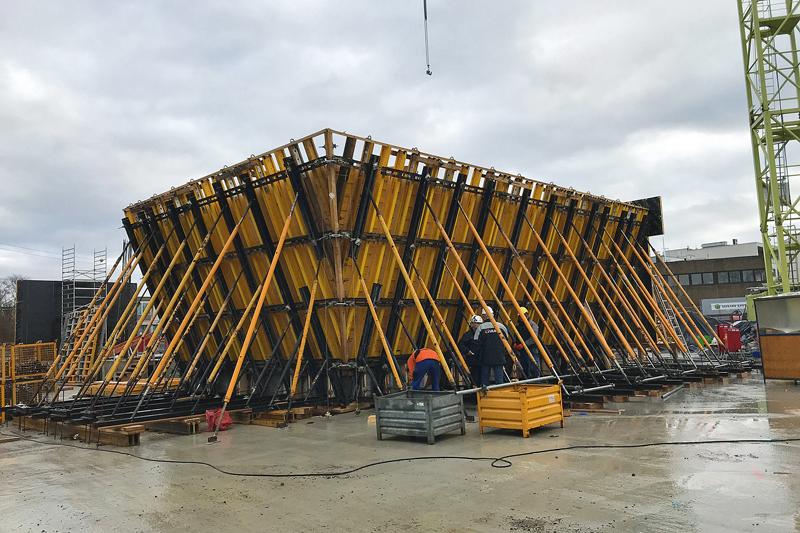 Die definierten Anforderungen konnten nur durch den Einsatz von Sonderschalungselementen erfüllt werden, bei deren Details viele unterschiedliche Anforderungen zu berücksichtigen waren. So stand fest, dass eine Befestigung des Stahlgerippes an der darunter liegenden Decke des Untergeschosses nur eingeschränkt möglich wäre, da zwischen Tiefgarage und Gebäude eine 1,5 m breite Schwindgasse um das Bauwerk herum verläuft. Diese soll Setzungen des Gebäudes vorbeugen und wird erst nach Betonage der letzten Decke geschlossen. Um aber durchgängig eine sichere Aufstellebene für die Schalungssysteme des Erdgeschosses zu schaffen, mussten teilweise zusätzliche Fundamente beziehungsweise eine Betonschicht erstellt werden. Des Weiteren galt es, die Sonderschalungen so zu konfektionieren, dass die für die Erstellung der Holzstruktur aufzubringenden Planken unsichtbar an der Schalungsrückseite verschraubt werden konnten und ein Ausschalen ohne Beschädigung der Kanten sichergestellt war.