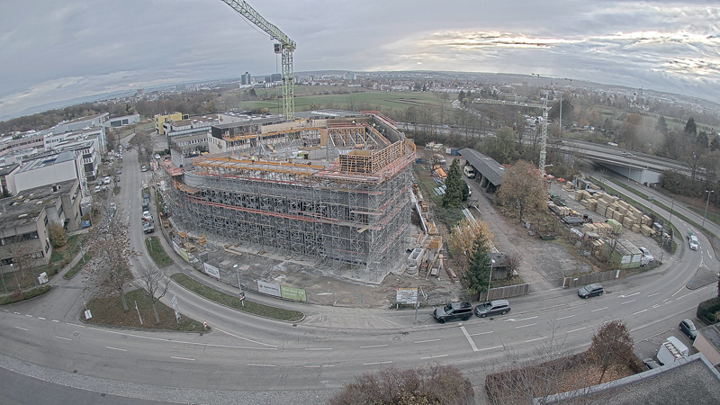Der Grundriss ist der Grundstücksform folgend ein abgewandeltes Dreieck mit erst runden und dann rechtwinkligen Ecken. Die ästhetisch und energetisch gleichermaßen hochwertige Fassade wird, ohne weitere Verwendung künstlich hergestellter Dämmstoffe, mit einer auf den Dämmbeton aufgebrachten Holzstruktur hergestellt. Eine bauliche Reminiszenz an die Wurzeln des 1909 als Zimmerei gegründeten Unternehmens. Im Innenraum werden puristisch anmutende Materialien wie Sichtbeton, geschliffene Betonböden und Holzoberflächen eingesetzt. Auf drei Geschossen mit einer Fläche von 4 300 m² entstehen überwiegend offene Bürostrukturen. Konferenz- und Veranstaltungsbereiche, ein Betriebsrestaurant sowie ein »Vita-Campus« ergänzen die Büroflächen. Ein Atrium sorgt für Luftigkeit und verbindet als Erschließungspunkt alle Geschosse. Das Untergeschoss bietet Raum für Tiefgarage und Haustechnik wie Wärmepumpe, Blockheizkraftwerk und Eisspeicher. Für den Entwurf des Gebäudes zeichnet das Stuttgarter Architekturbüro Ackermann+Raff verantwortlich. Die Erstellung des Rohbaus erfolgte bis Dezember 2020.