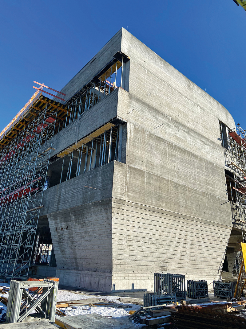 Die komplexeste Anforderung der Baumaßnahme war die Herstellung der 60 cm starken schrägen Leichtbetonwände des Erdgeschosses, die innen glatt, nach außen aber abgestuft sind und hier die für das Gebäude charakteristische Holzstruktur aufweisen. »Dies war bau- und schalungstechnisch ein absolutes Novum, das wir nur mit einem Partner lösen konnten, der über dezidierte Kenntnisse im Sonderschalungsbau sowie über das besondere Druckverhalten von Leichtbeton verfügt«, erläutert Dusan Koluvija, der bei Gustav Epple für das Prestigeobjekt verantwortliche Bauleiter.