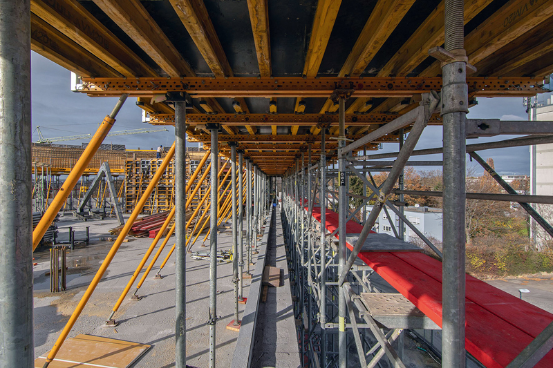 »Damit die Mitarbeiter vor Ort sicher arbeiten konnten, haben wir für die Schalung, das Bewehren und Betonieren ULMA-Deckentische benutzt«, erläutert Koluvija. Auf Gerüsttürmen im Außenbereich wurden die Deckentische gelagert. Diese Türme wuchsen mit dem Gebäude bis zu einer Höhe von 14,21 m mit. Im Innern wanderten die Deckentische nach der Betonage der Decke um eine Etage nach oben, um dort die nächste Aufstandsfläche für die nächste Brüstung zu bilden. »Um zu jedem Zeitpunkt eine zuverlässige Absturzsicherung zu gewährleisten, haben wir alle Deckentische mit MBP-Gitterelementen ausgestattet«, so Hannawiya.