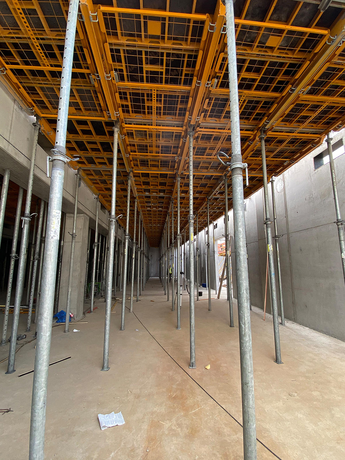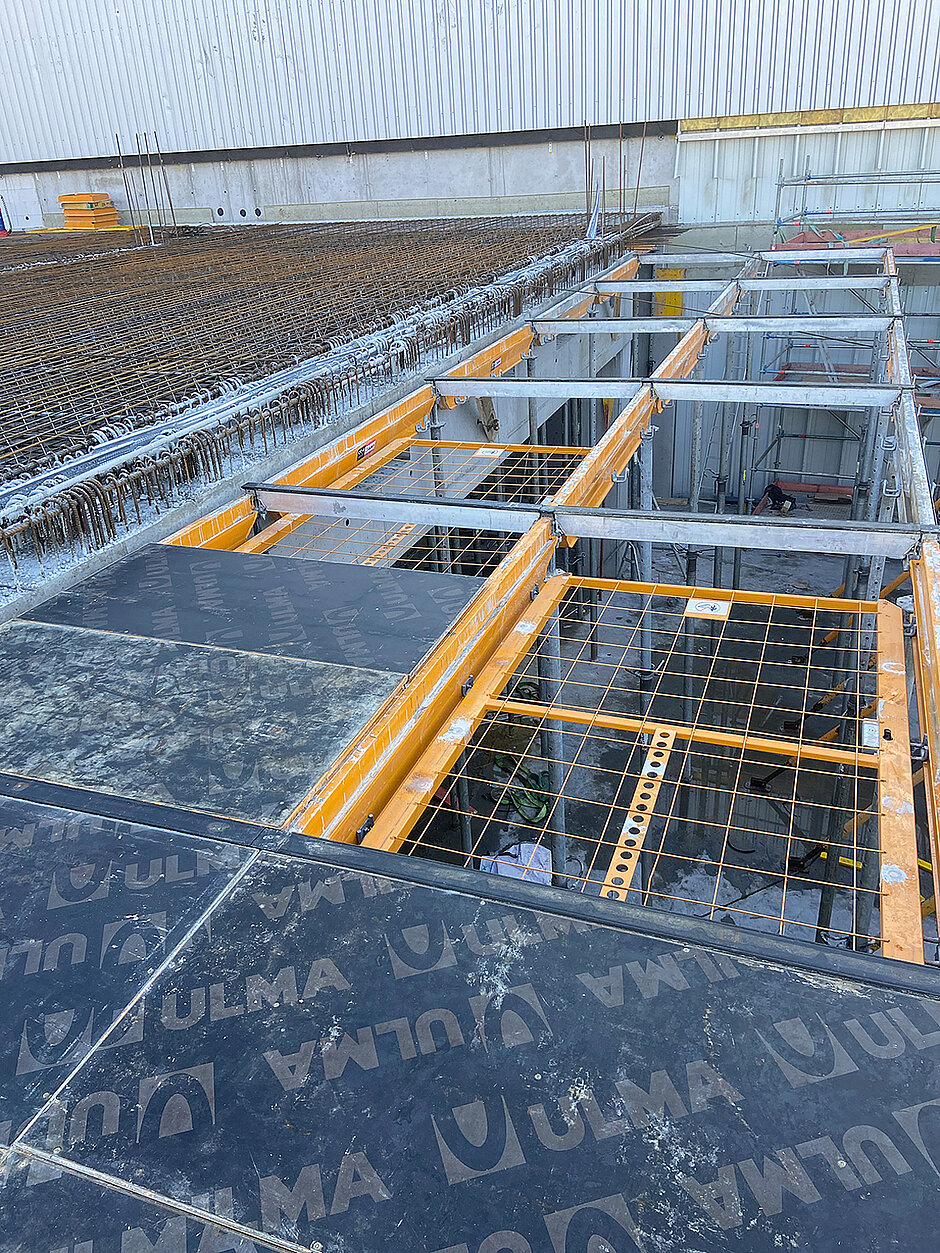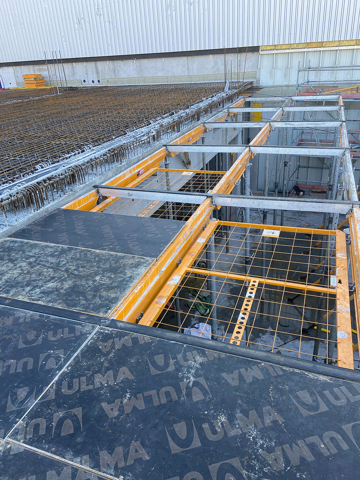 Auch für die Architektur mit fast quadratischer Hallenkonstruktion bot das ULMA-System eine Schalungslösung: Die Last der ebenen Decken liegt auf massiven Unterzügen bzw. zwischen Wand und Unterzug, ohne einzelne Stützen dazwischen. Zunächst wurden die Wände vorbetoniert. Danach konnten die Felder der Deckenschalung aufgebaut werden. Da die Deckenfelder über die gesamte Länge von 55 m frei waren und keine Störstellen oder Stützen mitten im Raum berücksichtigt werden mussten, konnten die Fallschutzgitter leicht in die nächste Position verschoben werden. t