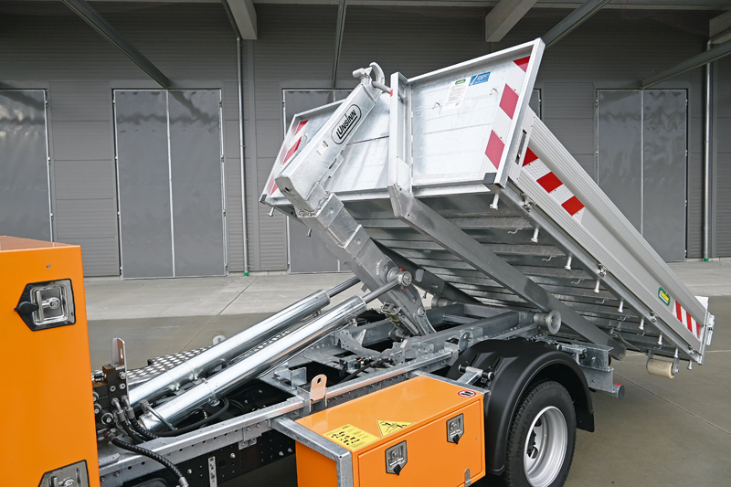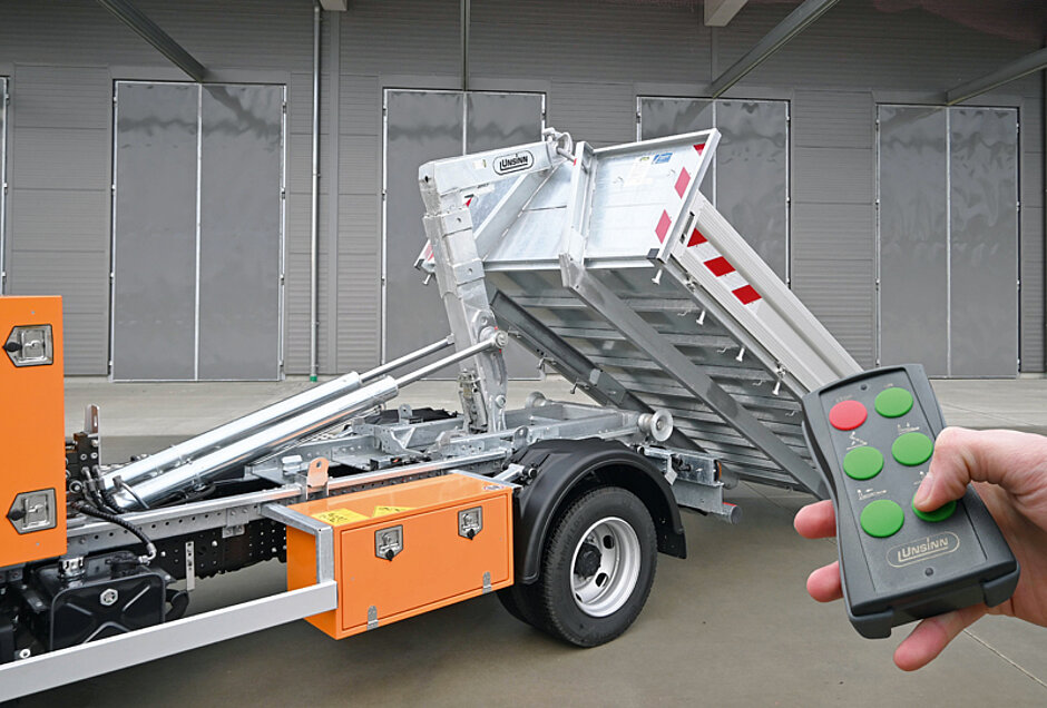 Alle Abrollsysteme der Marke Unsinn sind jetzt mit dem inhouse produzierten Hakenlift samt Sanftanlauf ausgestattet. Durch die intuitive Bedienung des Abrollhakens kommt der Abrollbehälter kontrolliert und geräuscharm am Boden auf. Von der Sanftanlaufsteuerung sollen auch hochwertige Fahrzeugkomponenten profitieren, die so mehr geschont werden. Komfort, sowohl bei der Aufnahme als auch beim Kippen der Behälter, sichert die Funkfernbedienung mit optimierter Energieversorgung. Die modulare Bauweise des Unsinn-Abrollsystems bietet zudem diverse Optionen für die Nachzurüstung, beispielsweise mit einer Kranvorbereitung oder einer hydraulischen Verriegelung, die zur Sicherung des Containers genutzt werden kann. Die Hydraulik am Heck ermöglicht unter anderem, einen angehängten Kipper oder Sinkkastenreiniger zu bedienen.