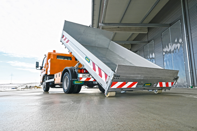 Das Unsinn-Abrollsystem bewegt Abroll-Container mit einer Hub- und Kippkraft von 5 t bis 7 t und wird an das zulässige Gesamtgewicht des jeweiligen Fahrzeuges angepasst. Zum Schutz vor Korrosion sind der Abrollhaken – bestehend aus einem Schub- und zwei Kippzylindern – sowie der Heckunterfahrschutz im Tauchbad feuerverzinkt. Die optimale Ausrichtung des Abrollbehälters beim Auf- und Abladen unterstützen die hohen Führungsrollen am Heck. Dank des großen Kippwinkels von bis zu 60° kann die Transportfläche schnell geleert werden – ideal, wenn Schüttgut befördert werden soll. Die Abrollsysteme werden nach DIN 30722, Teil 3, gefertigt und lassen den Transport von Standard- sowie individuellen Sonder-Containern mit Fahrzeugen unterschiedlicher Klassen (zGG 3,5 t bis 12 t) zu.