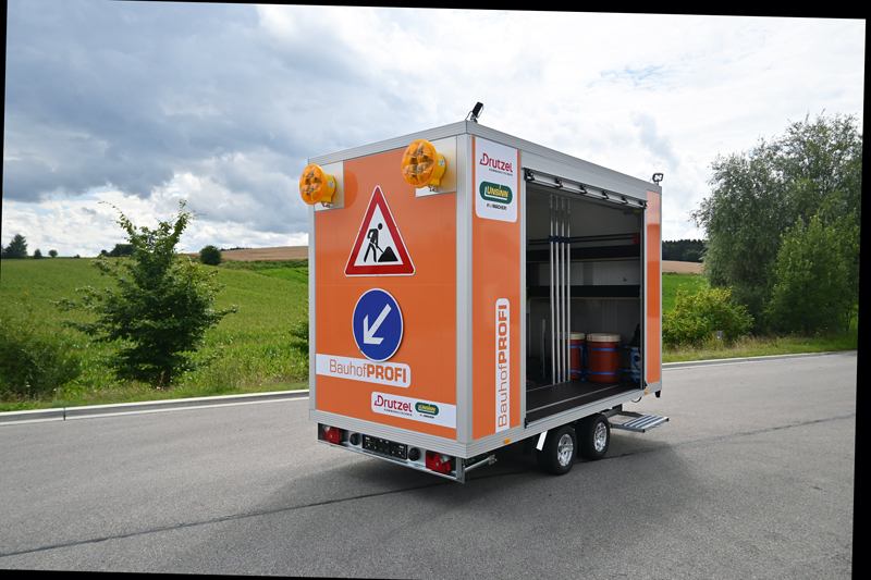 Als effizient gelten die Zuladungsmöglichkeiten durch in die Seitenwand integrierte absperrbare Rollos. Der Anhänger kann per Gabelstabler mit Paletten beladen werden, auch Werkzeug, Absperrzubehör oder Spezialausrüstung kann aufbewahrt werden. Weitere Sicherheit verspricht eine autarke Nachtbeleuchtung des Bauhofprofi. Damit können Innenraum und Arbeitsbereich großräumig ausgeleuchtet werden. t