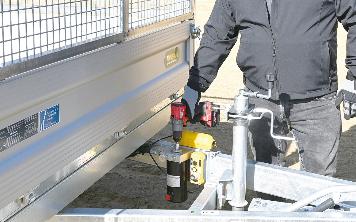 Die neuen Dreiseitenkipper UDK verfügen standardmäßig über einen integrierten Rampenschacht mit Spanneinrichtung und klappbarem Kennzeichenhalter. Damit sind die Auffahrrampen während der Fahrt unter der Ladefläche verstaut und hinter dem Kennzeichenhalter versteckt. Die Ladefläche des UDK kann per Elektrohydraulik auf drei Seiten gekippt werden. Sollte die E-Hydraulik zum Kippen nicht zur Verfügung stehen, lässt sich die Kipperbrücke mit der Notpumpe mittels Akkuschrauber bewegen. t
